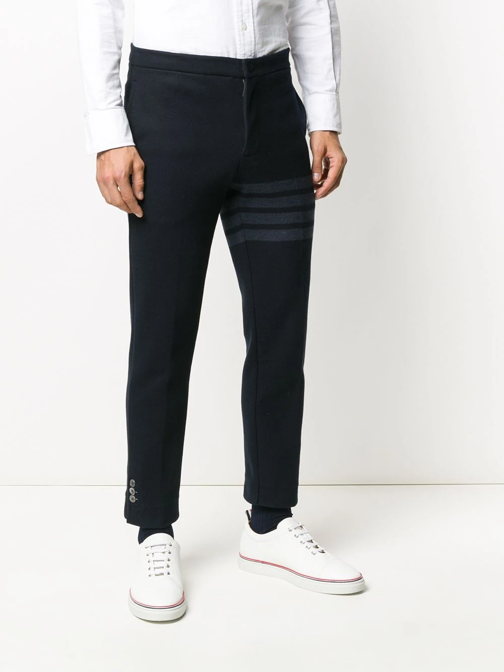 Casual Fridays are a thing of the past. These navy cotton slim-fit tonal 4-Bar trousers from Thom Browne will make you want to suit up every day of the week. Show them you mean business. Featuring a mid-rise, a slim fit, a front button fastening, side slit pockets, a cropped length, a stripe detail to the side, two back buttoned welt pockets, a signature tri-colour striped trim and a pull tab at the rear.