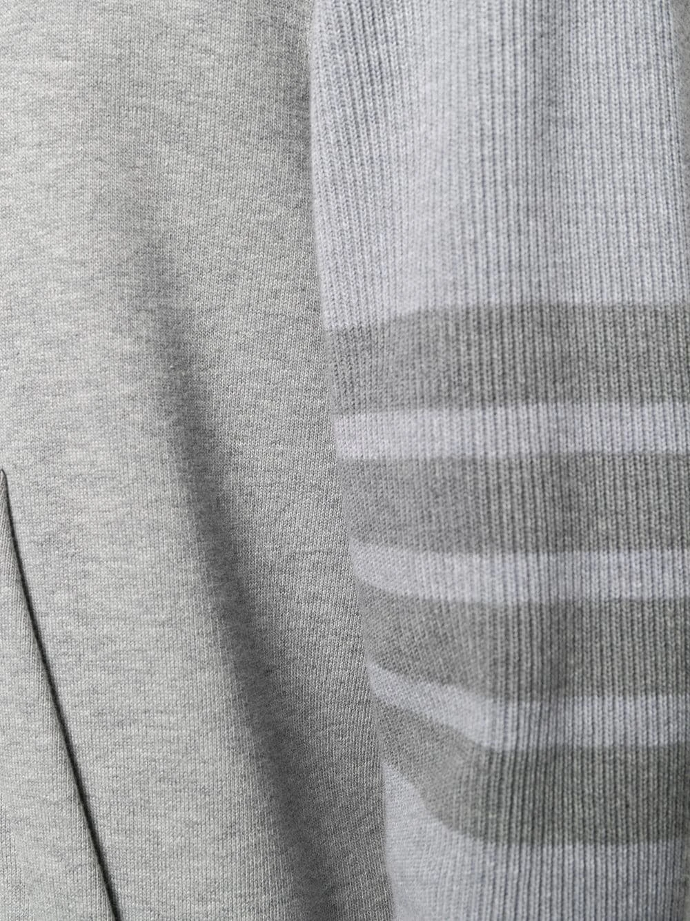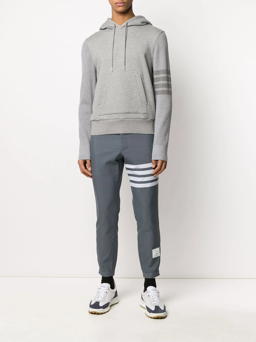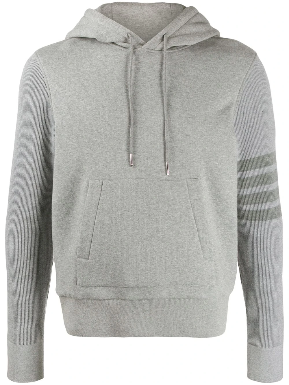 No more hitting the snooze button! This light grey cotton 4-Bar loopback hoodie from Thom Browne will make those (very early) morning walks to the gym slightly more bearable. No pain, no gain – and definitely no Thom Browne. Featuring a hood with drawstring tie fastenings, ribbed trimming, a short length, a stripe detail to the side, a kangaroo pocket and a straight hem.