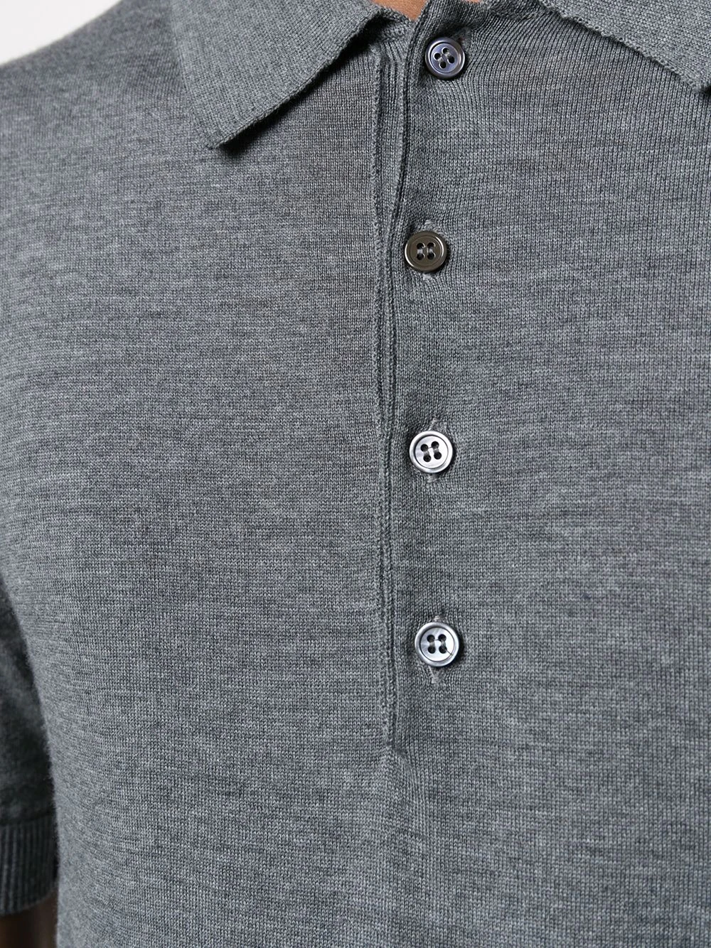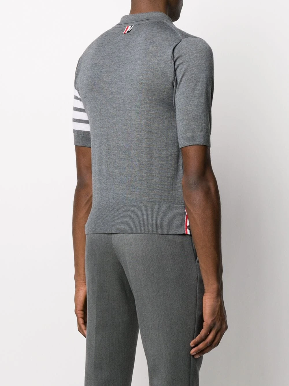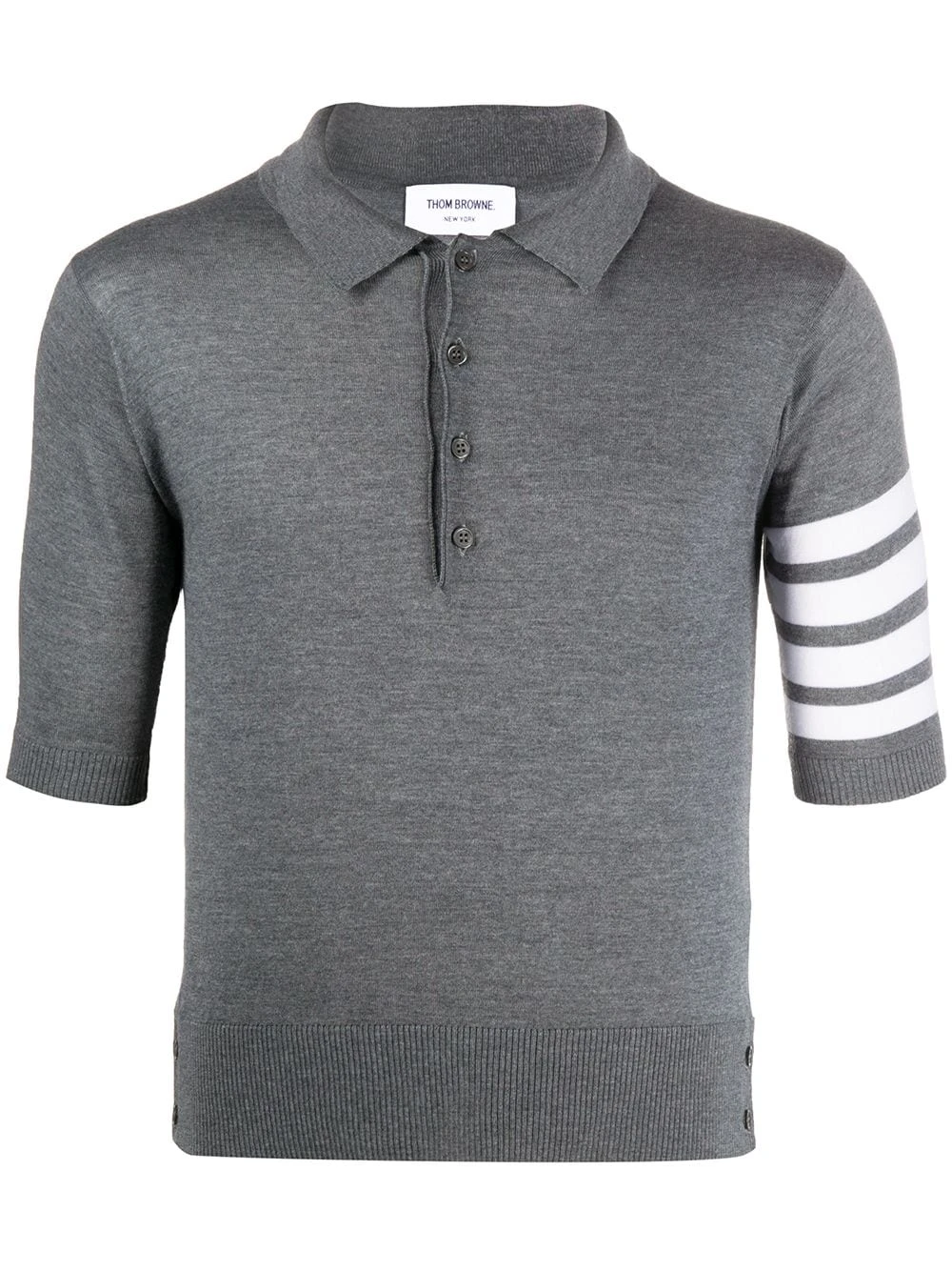 Channel your inner jock with this medium grey merino wool polo shirt from Thom Browne. With the brand’s signature 4-Bar stripes on the arm, this top will add a sporty finish to any look. Featuring a classic polo collar, short sleeves, fitted and signature 4-Bar stripes.