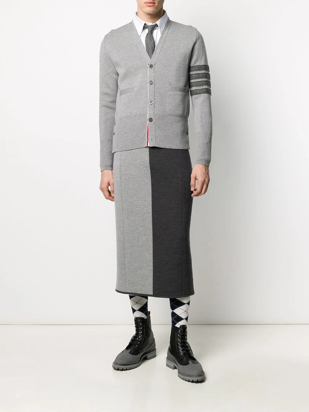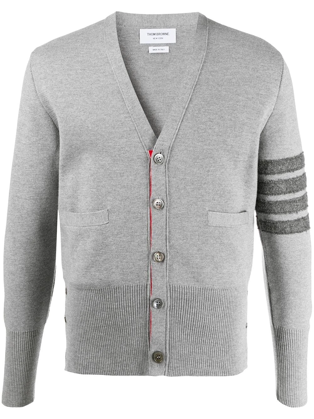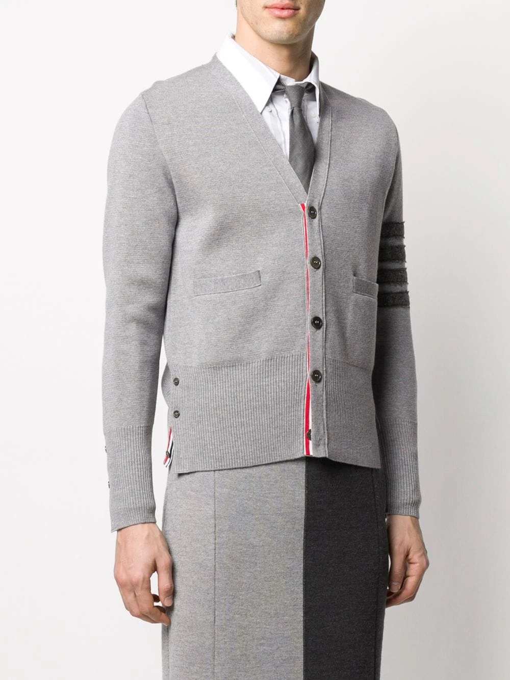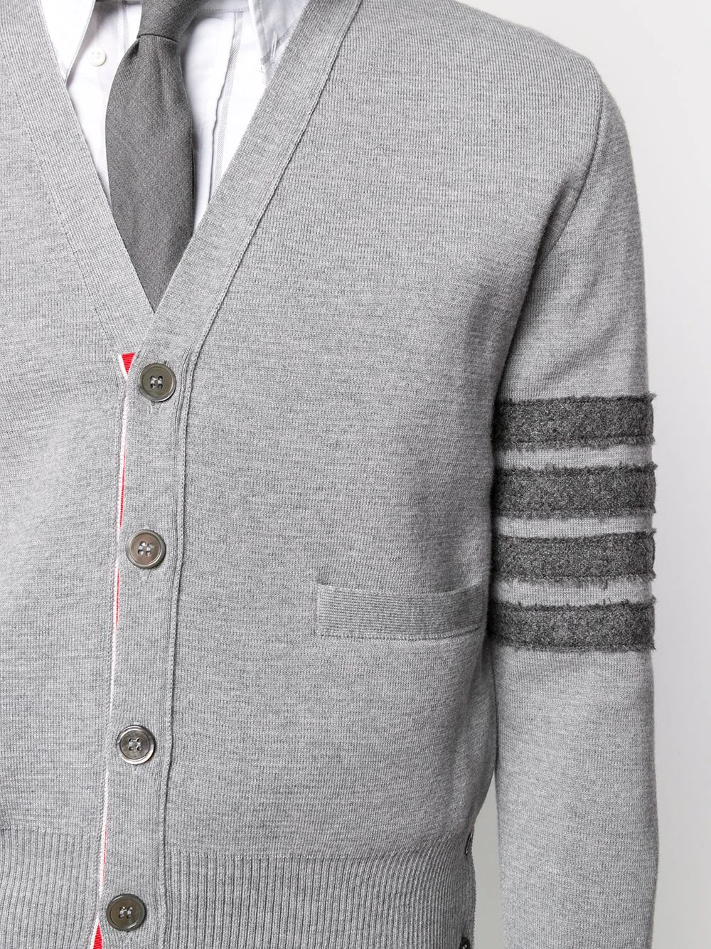 Thom Browne put their signature stamp on this 4-Bar V-neck cardigan. Made from merino wool, this button-down knit has been designed with a signature striped interior trim and the recognisable 4-Bar design to the left sleeve. It’s sure to become your newest go-to.Β