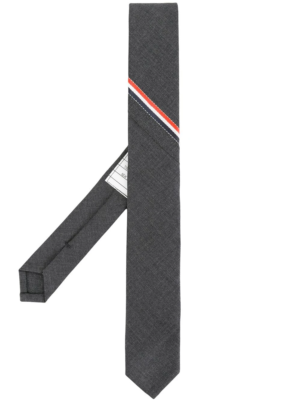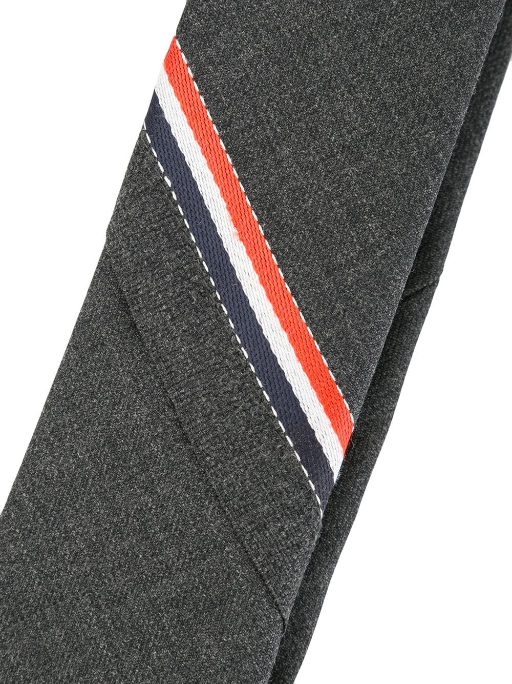 Dark grey wool classic necktie from Thom Browne featuring a pointed tip and a signature red, white and blue stripe detail.