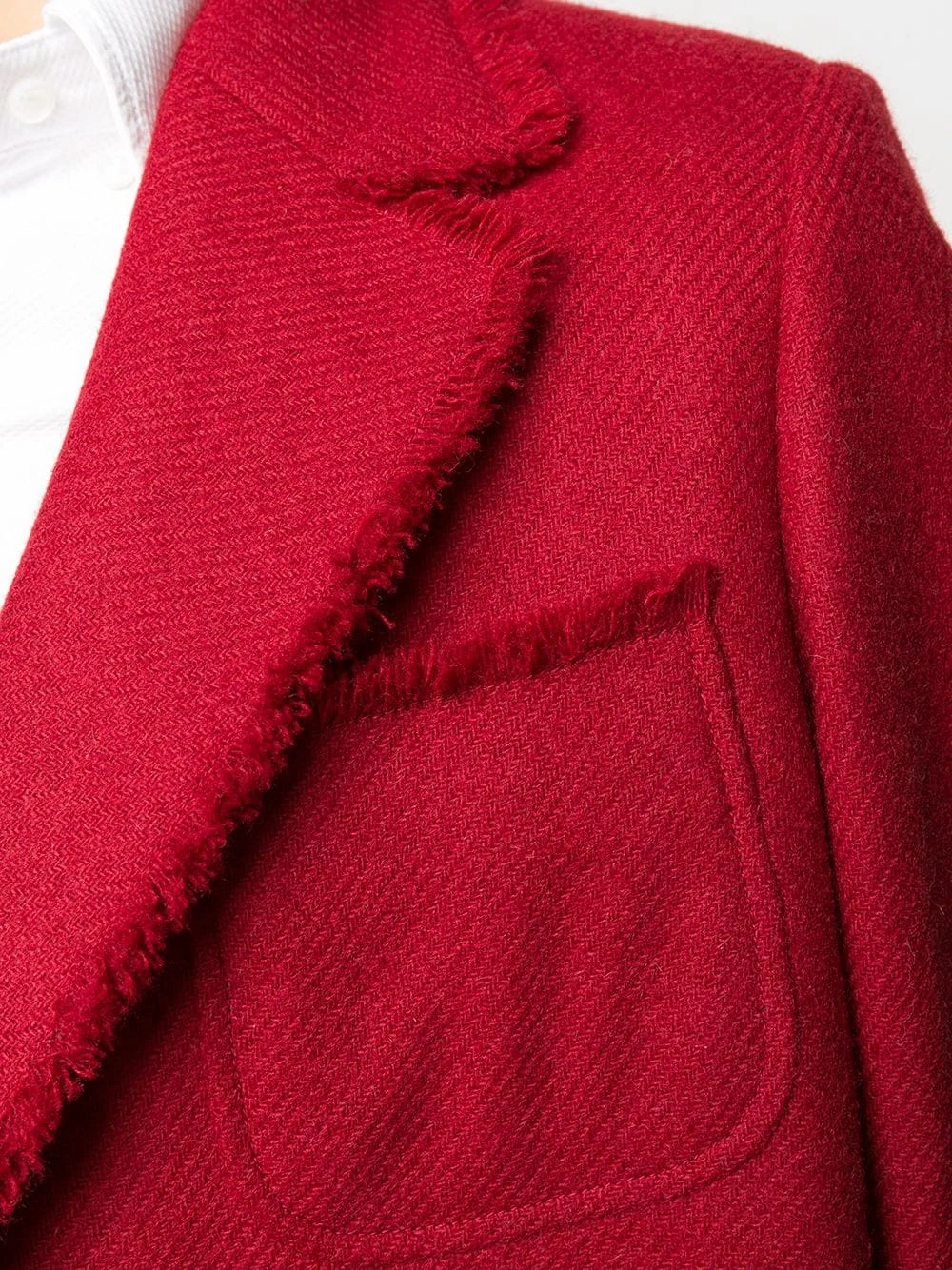 Life’s isn’t always perfect, but this Thom Browne jacket is. Made from Shetland wool, this red narrow shoulder frayed sack jacket is pretty much the perfect compliment to any outfit. Is it in your shopping bag yet? Featuring a notched collar, a front button fastening, long sleeves, a chest pocket, two front pockets, button cuffs, a back slit at hem and a tricolour grosgrain tab on the rear.