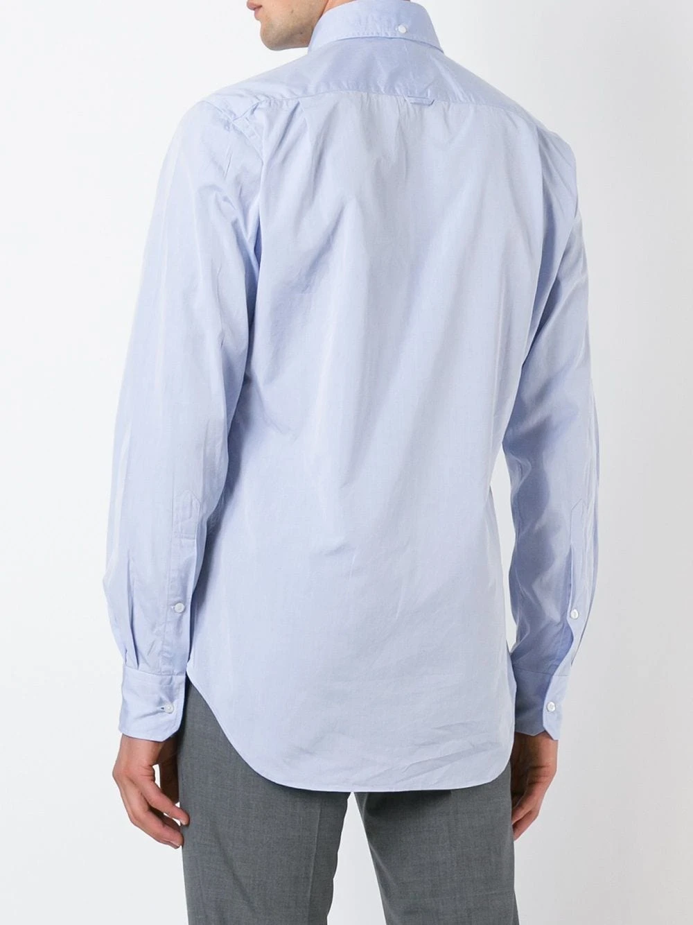 Light blue cotton grosgrain placket shirt from Thom Browne featuring a button down collar, a front button fastening, a chest pocket, long sleeves, button cuffs, a front logo plaque, a slim fit, a curved hemline and a signature tri-colour striped grosgrain trim.
