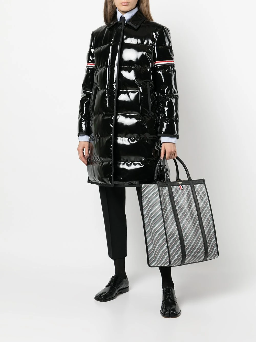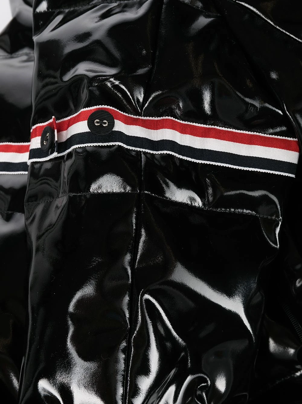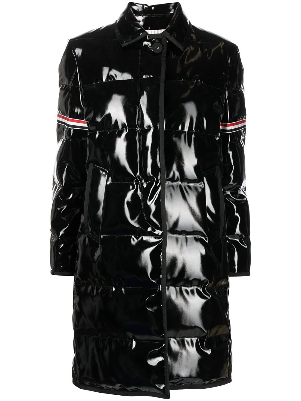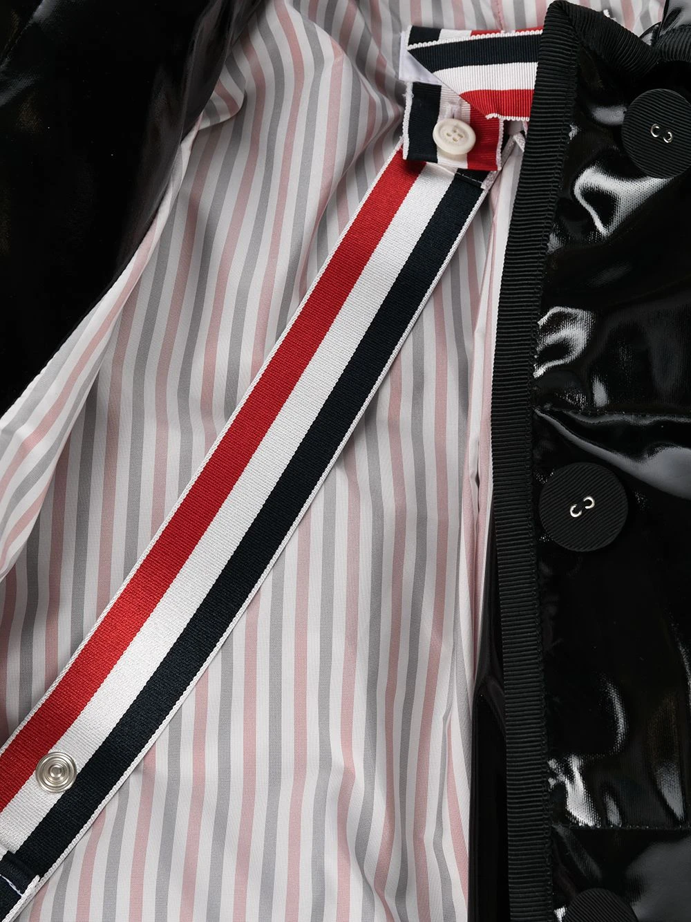 A high-shine finish creates a contemporary look for this Thom Browne coat. This is further enhanced by the piece’s signature RWB-stripe detailing.