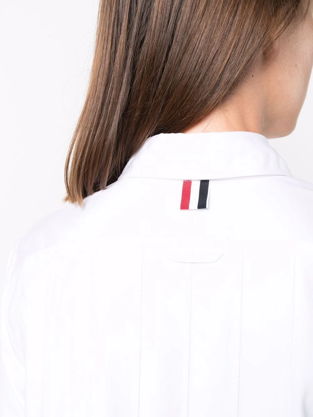 Thom Browne became widely recognized because of his womenswear collections after U.S. first lady Michelle Obama wore one of his designs, in 2013. His designs include elegant and timeless pieces like this white long-sleeve pleated shirtdress, crafted from soft cotton.