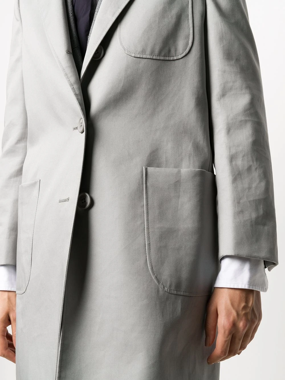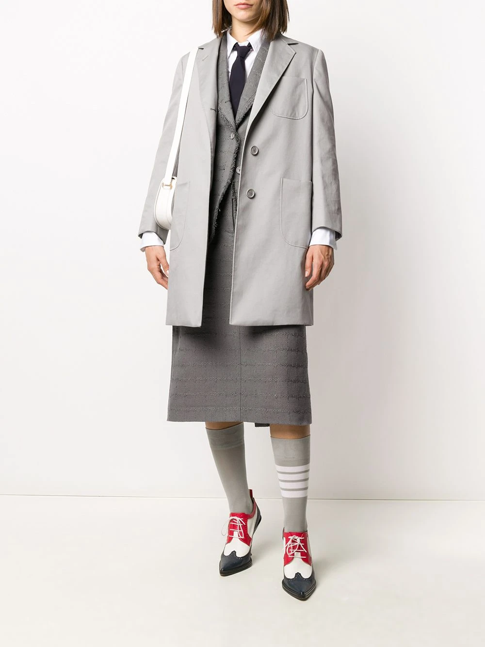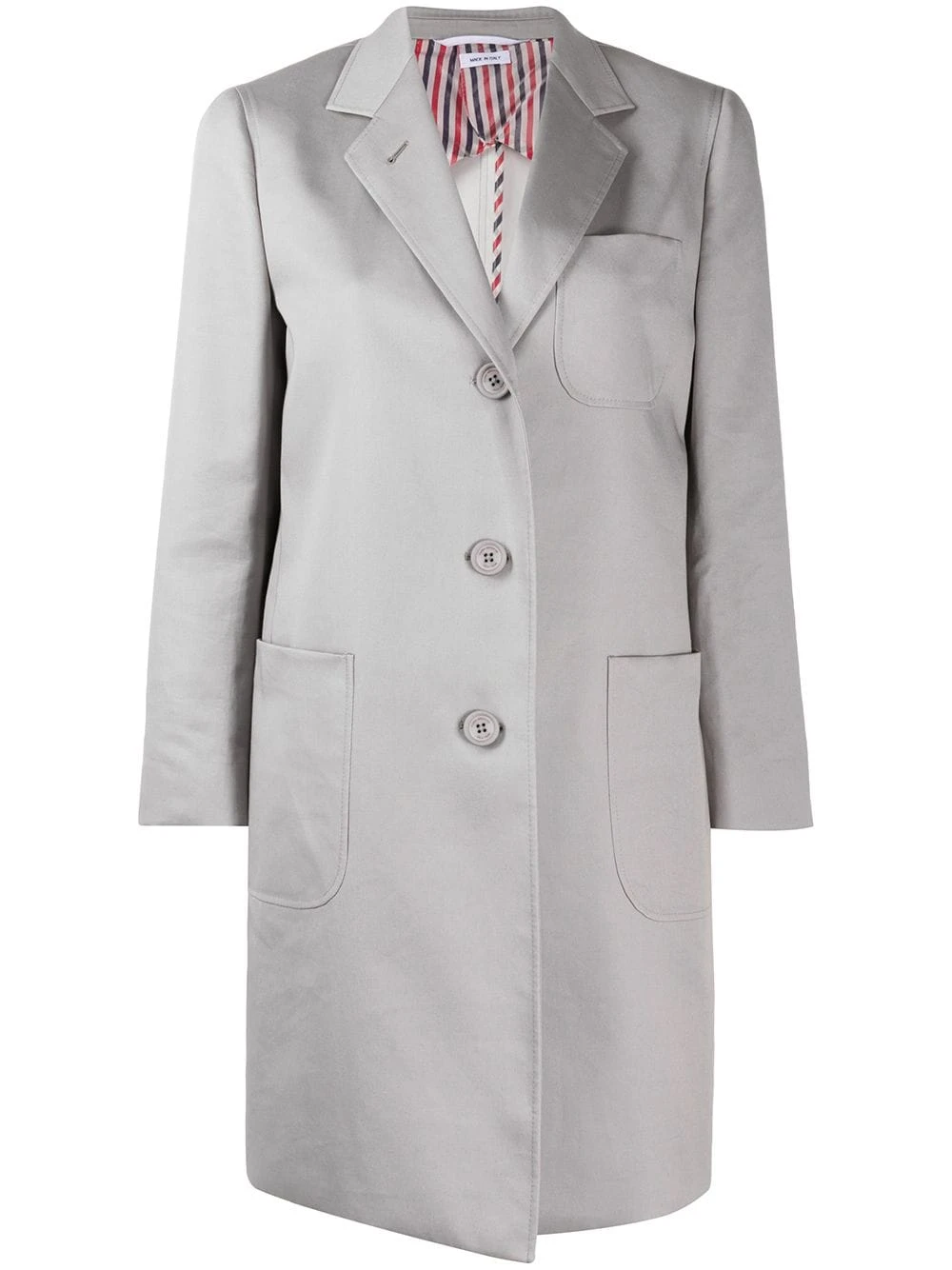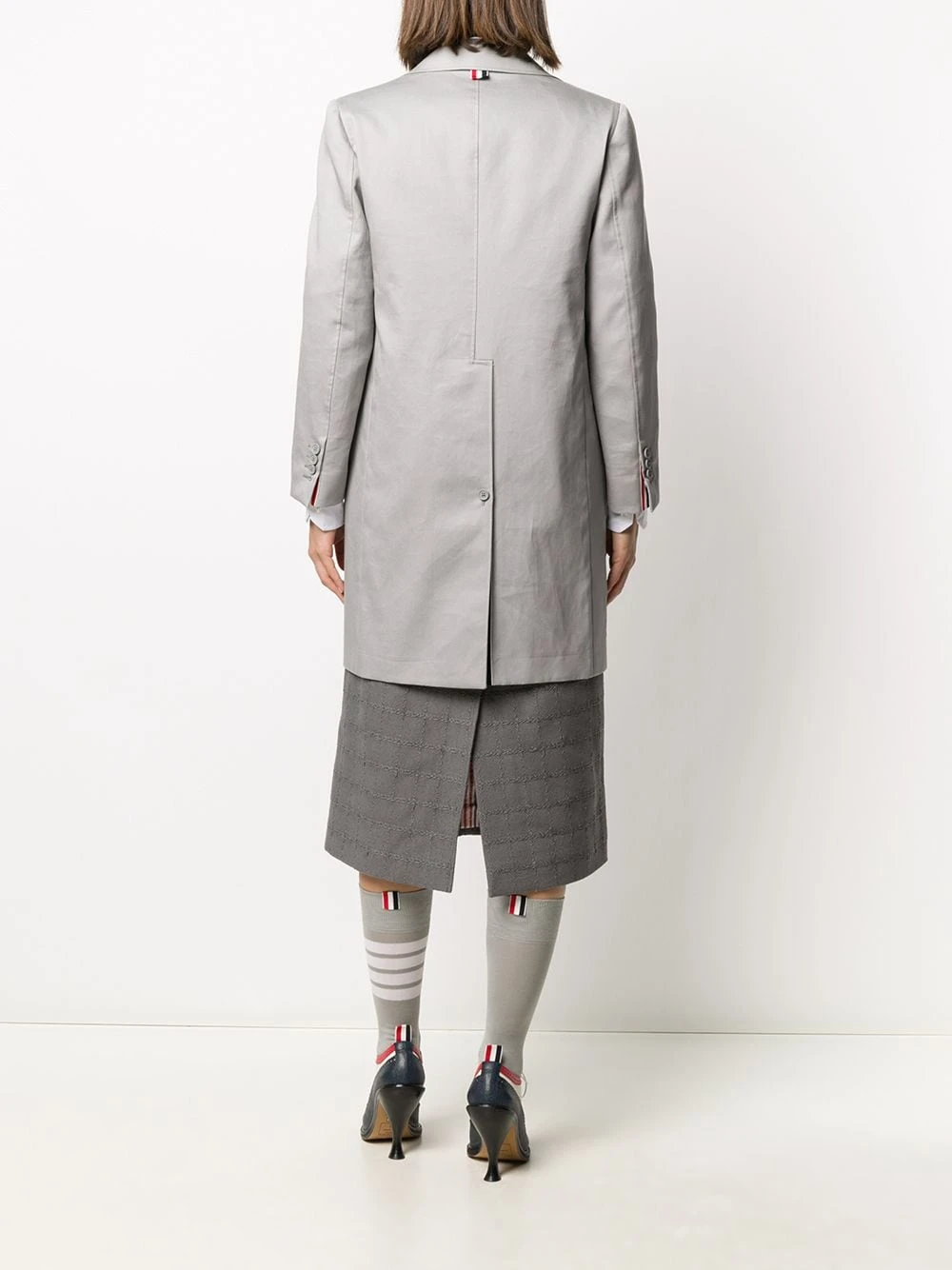 Life is unexpected. But one thing is for certain. Slip on this mid-length overcoat from Thom Browne and your outerwear will be exactly like you want it to be.
