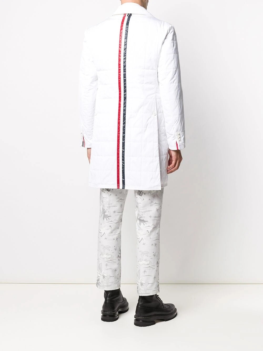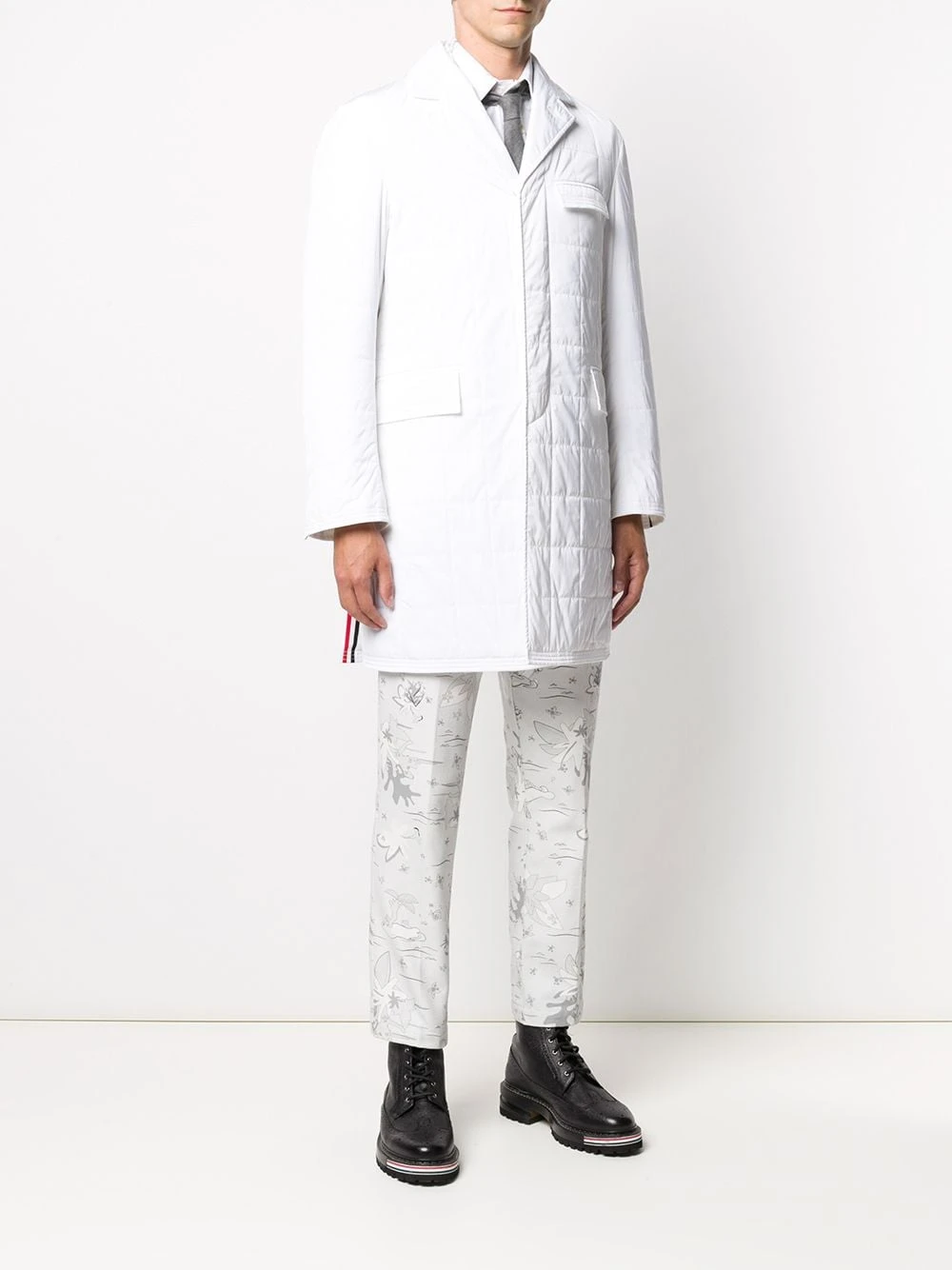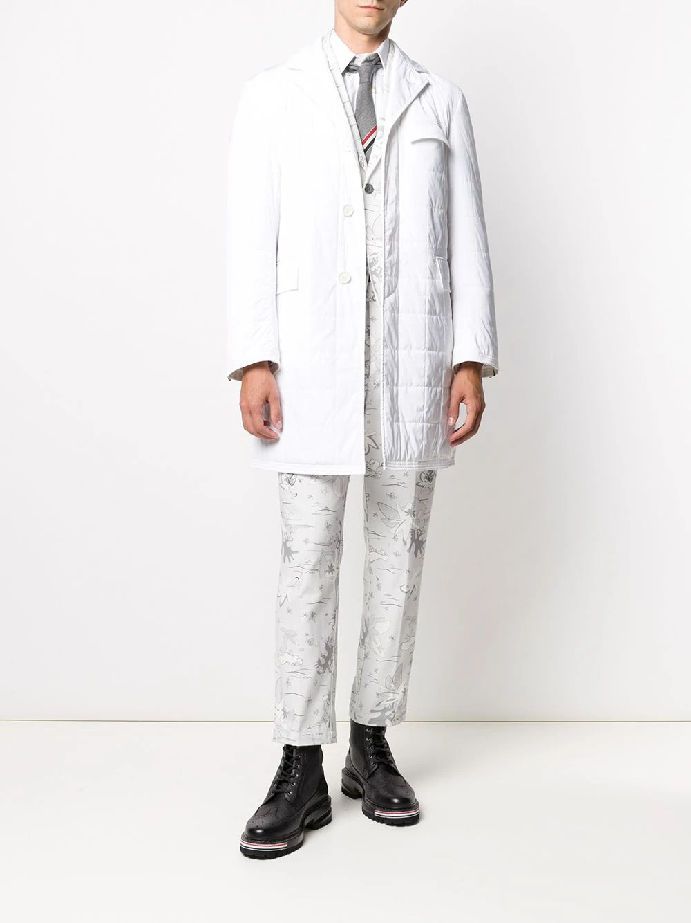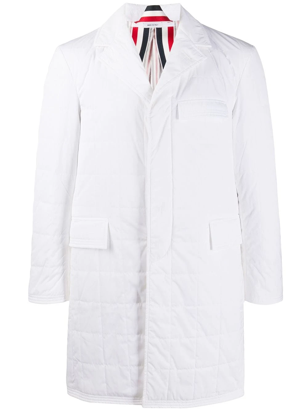 Ever wish you could take your lab coat home with you? We’ve got the next best thing. This white Chesterfield overcoat from Thom Browne is padded with goose-down, and quilted into a fine diamond pattern. The RWB stripe detailing at the back adds a high-fashion finish to this stand-out piece.