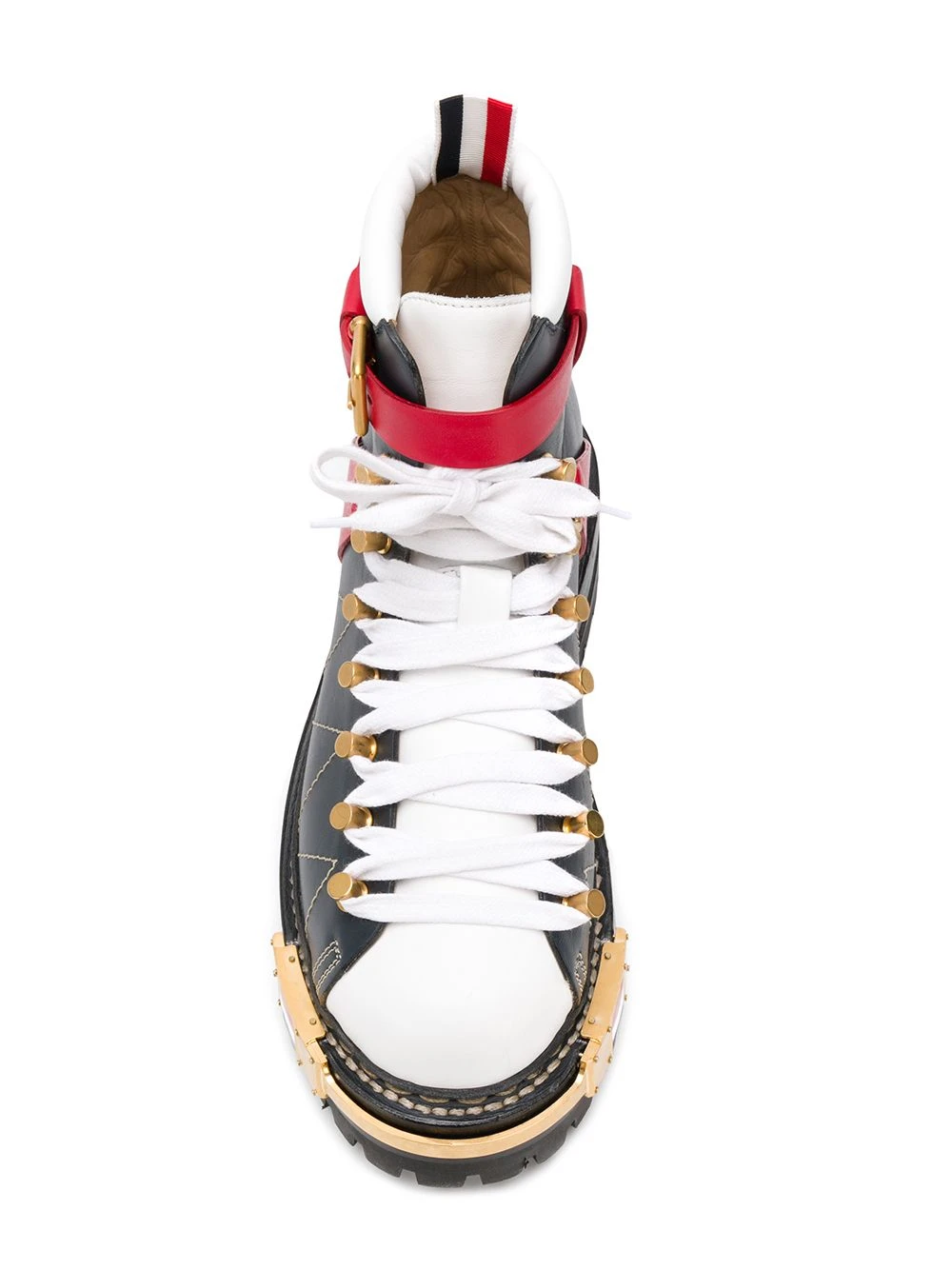 A wardrobe of reimagined – but never boring – classics, Thom Browne’s Autumn/Winter 2019 collection takes uniform dressing to chic new heights. Crafted in Italy from black leather, these red, white and red leather Rwb Hardware Hiking Boot from Thom Browne feature an ankle length, a round toe, a lace-up front fastening, an enamel buckle, a front logo plaque, a chunky low block heel and a ridged rubber sole.