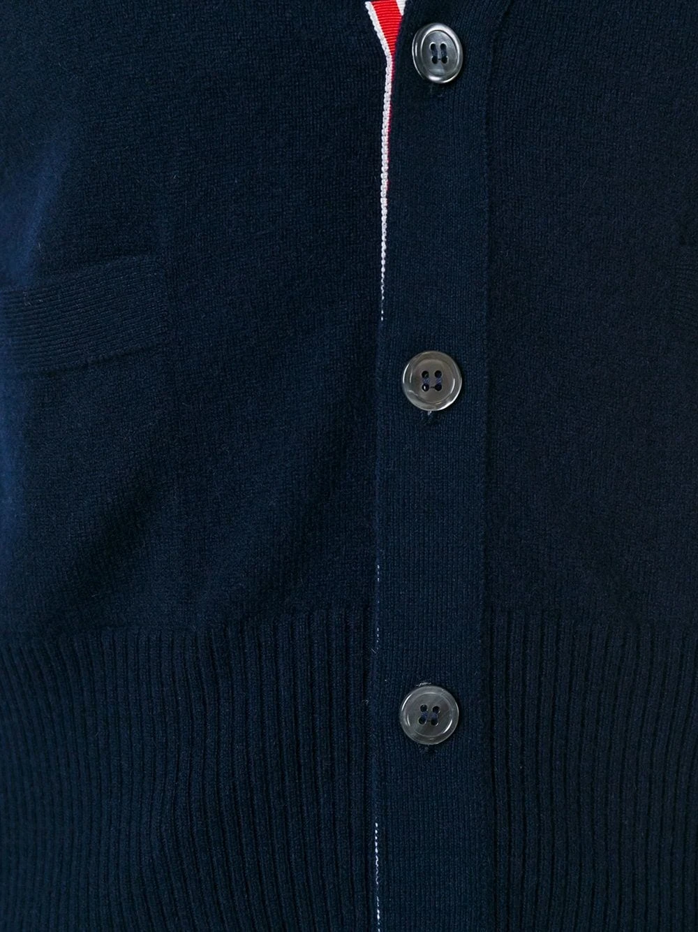 Blue cashmere sleeveless buttoned cardigan from Thom Browne.