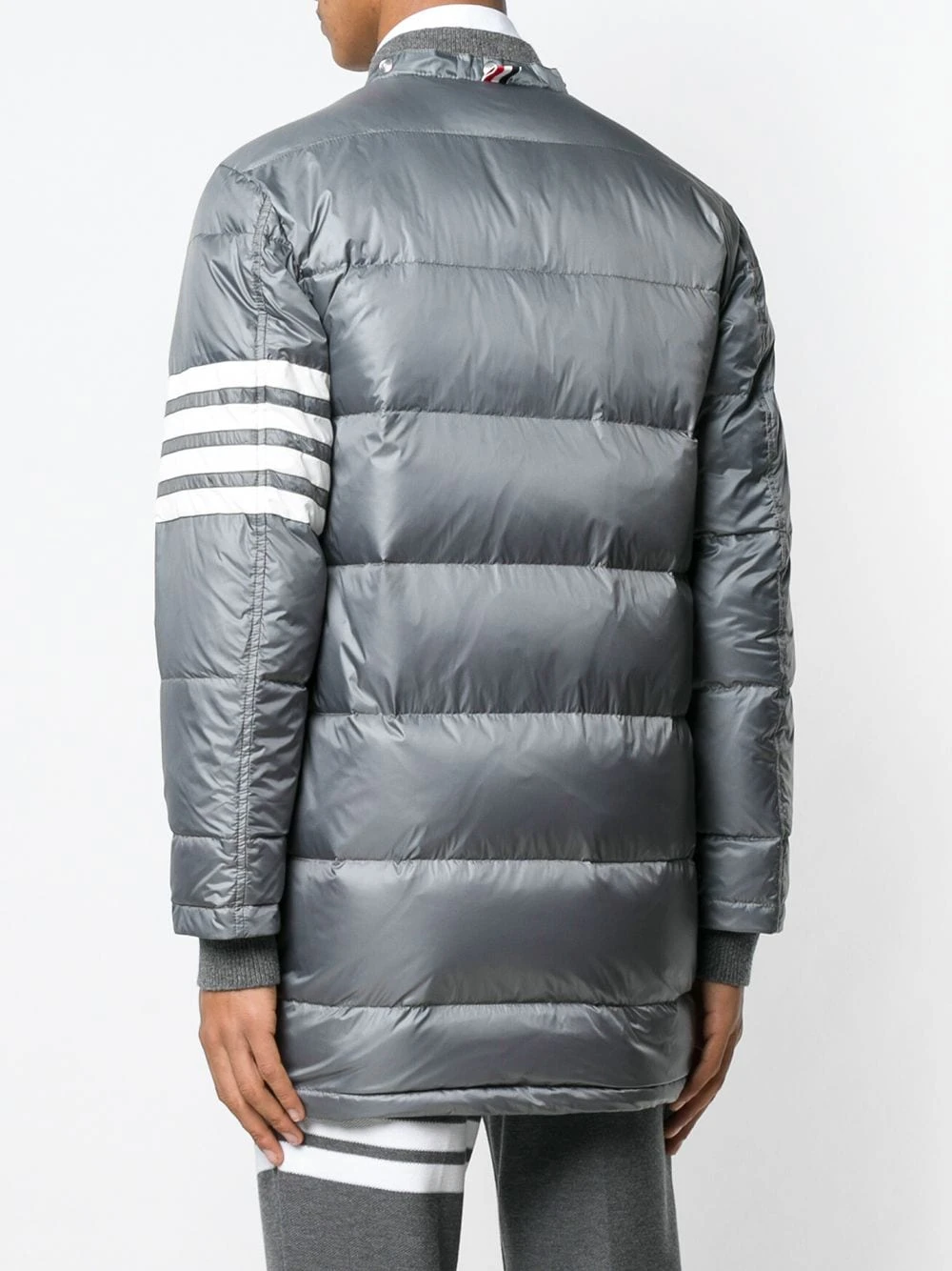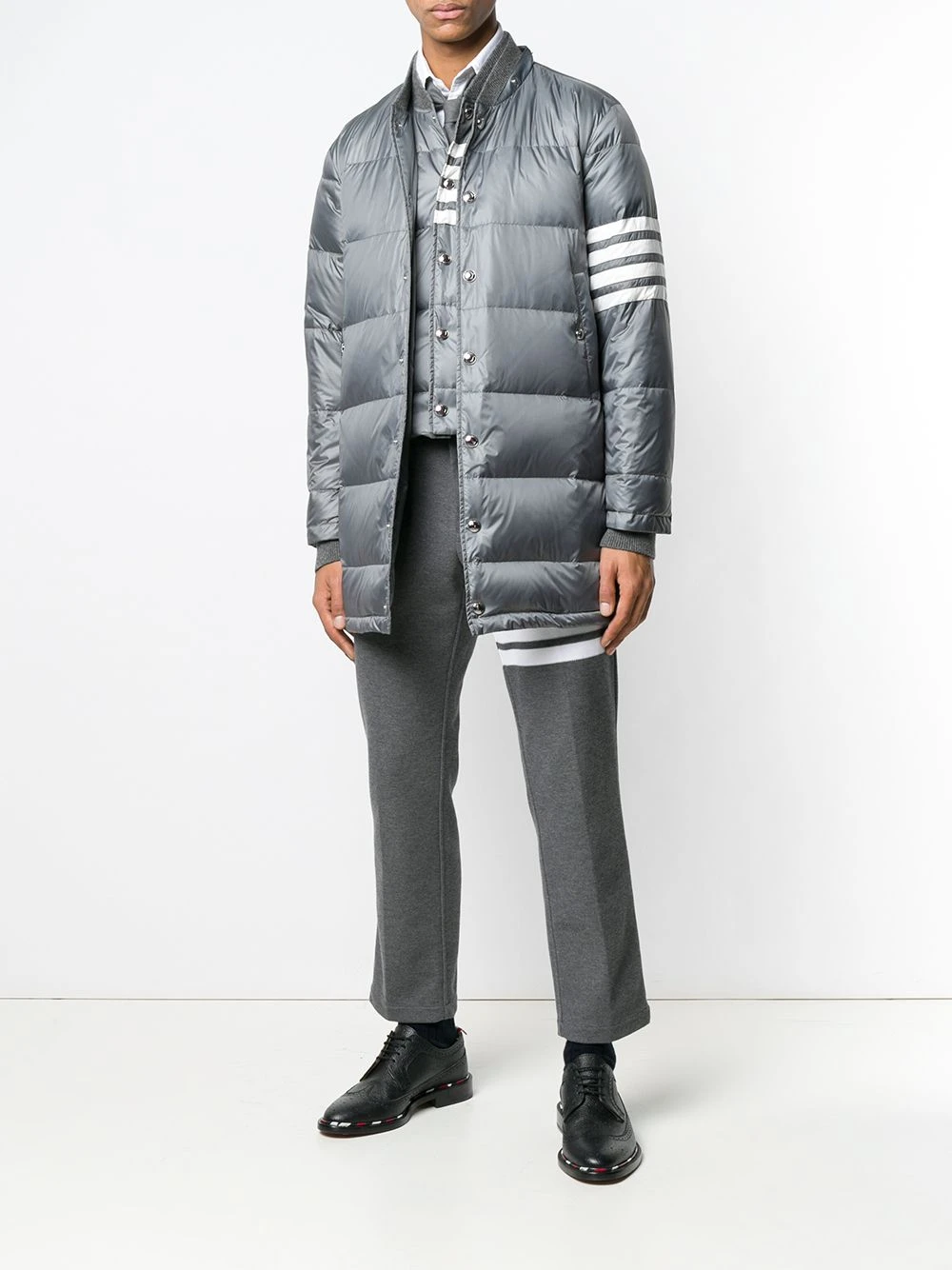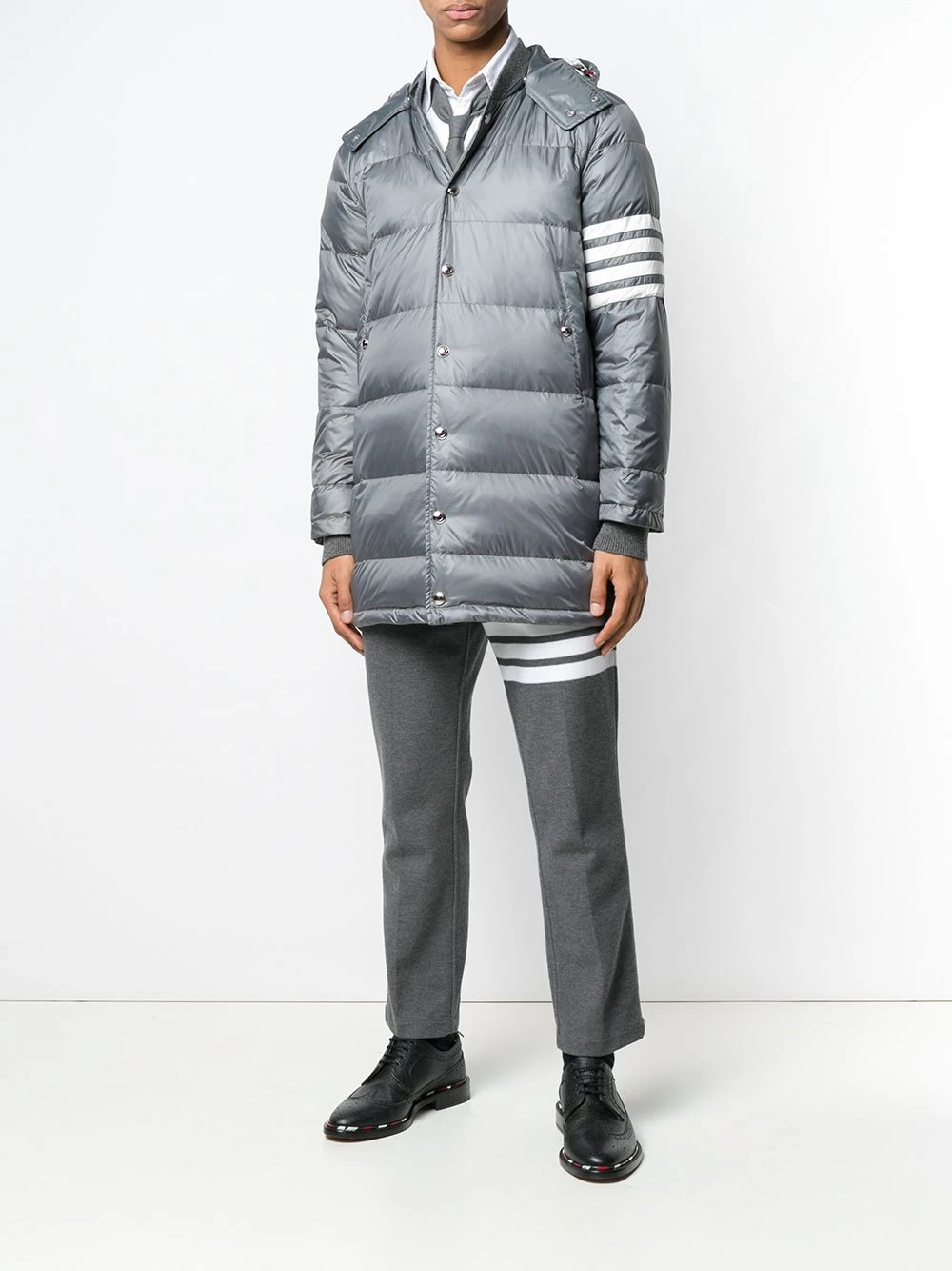 Reimagining menswear staples, Thom Browne tailors wools and tweeds to a modernised sportswear aesthetic. Quilted and padded with natural feather down, this Italian-crafted wool coat features a straight fit, a quilted effect, a snap fastening, a high standing collar, a hood, fitted cuffs, side pockets, a lining and four-bar stripes at the sleeve.