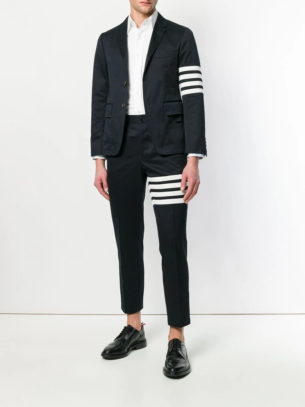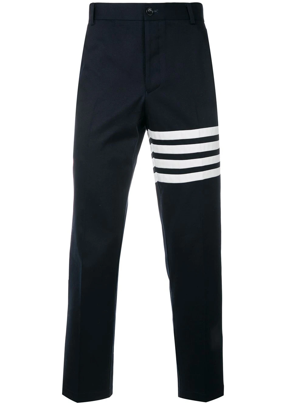 Business and pleasure combine in these trousers from Thom Browne. In a relaxed shape and a cotton twill construction – this pair looks just as at home in an important meeting as they do at your favourite bar. Just don’t bring your cocktail to work. Featuring a mid-rise, a slim fit, a button and zip fly, a waistband with belt loops, side slit pockets, two back buttoned welt pockets, creases, cropped, a signature tri-colour striped trim and sporty stripes at the left leg.