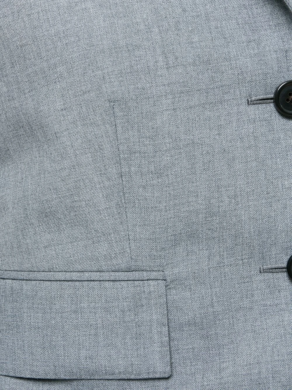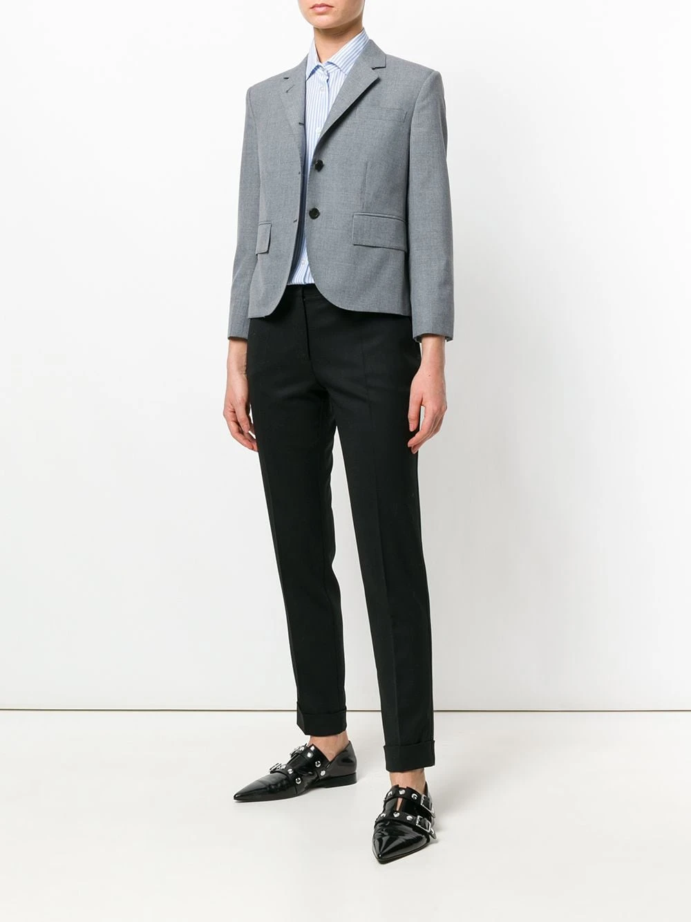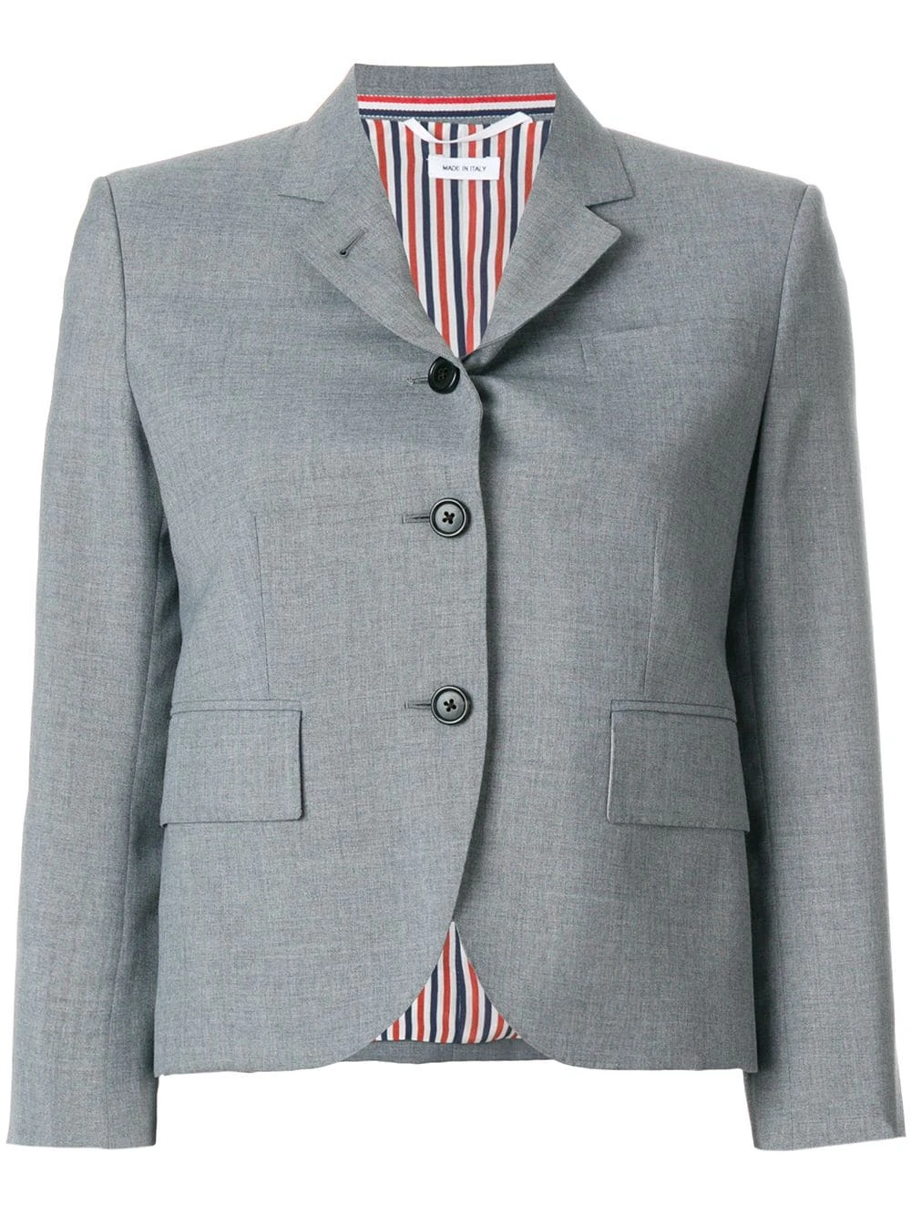 With a history in menβs formalwear, Thom Browne brings its tailoring expertise to the table when creating its womenβs collection, focusing on premium materials and expertly cut shapes. Smart and classic, this short structured blazer was crafted from a blend of grey wool, with a signature printed silk lining. Made in Italy, the country of fashion, it features notched lapels and a front button fastening. Its long sleeves have button cuffs with a grosgrain detail and, to the front, there’s flap pockets and a broad welt chest pocket. A traditional double vent is placed to the rear, along with a red, white and blue grosgrain stripe and an internal locker loop.