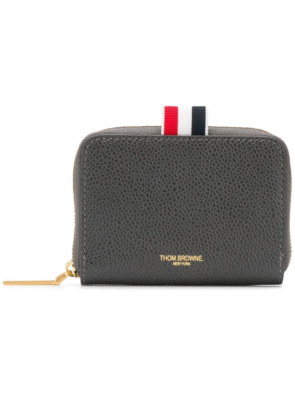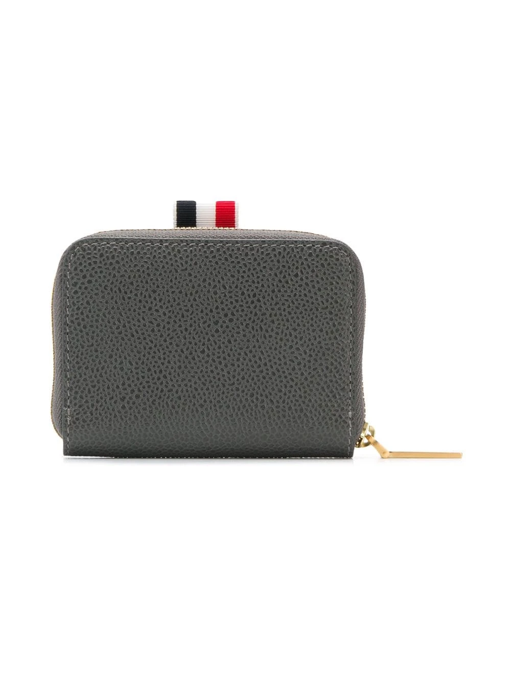 Dark Grey Pebbled Zip Around Wallet from Thom Browne featuring an all around zip fastening and a tricolour grosgrain tab.