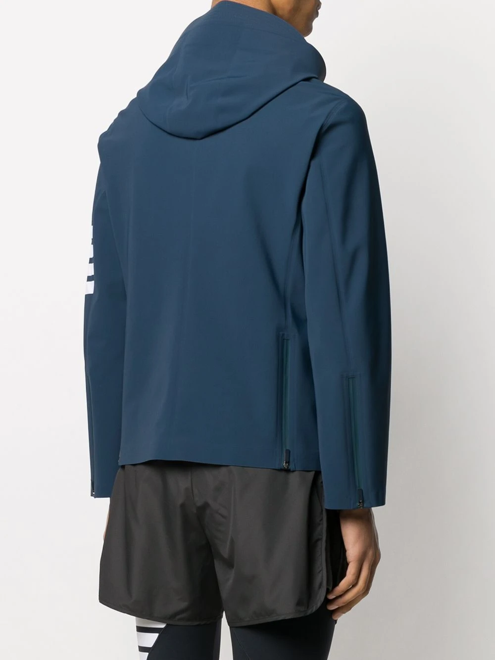 Four strikes and you’re Thom Browne. Showcasing the signature 4-Bar stripe detailing to the sleeve, this lightweight tech hooded jacket is part of Thom Browne’s innovative activewear collection, ensuring ultimate style whilst you work up a sweat. Or nip to the shop. Featuring a hood, a front zip fastening, long sleeves, a stripe detail to the side, front zipped pockets and side zip fastenings.