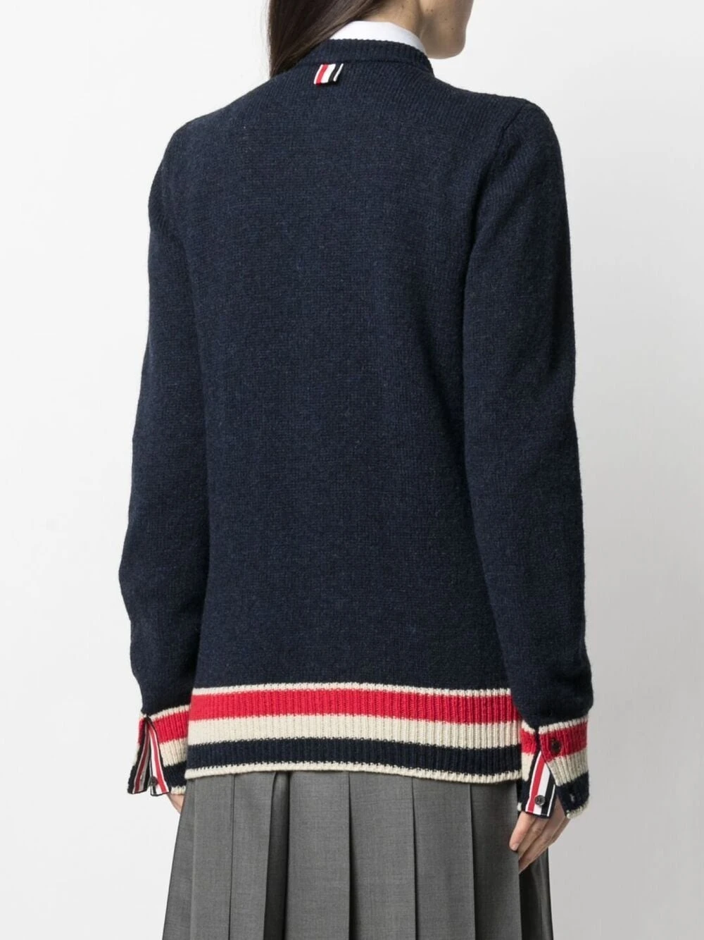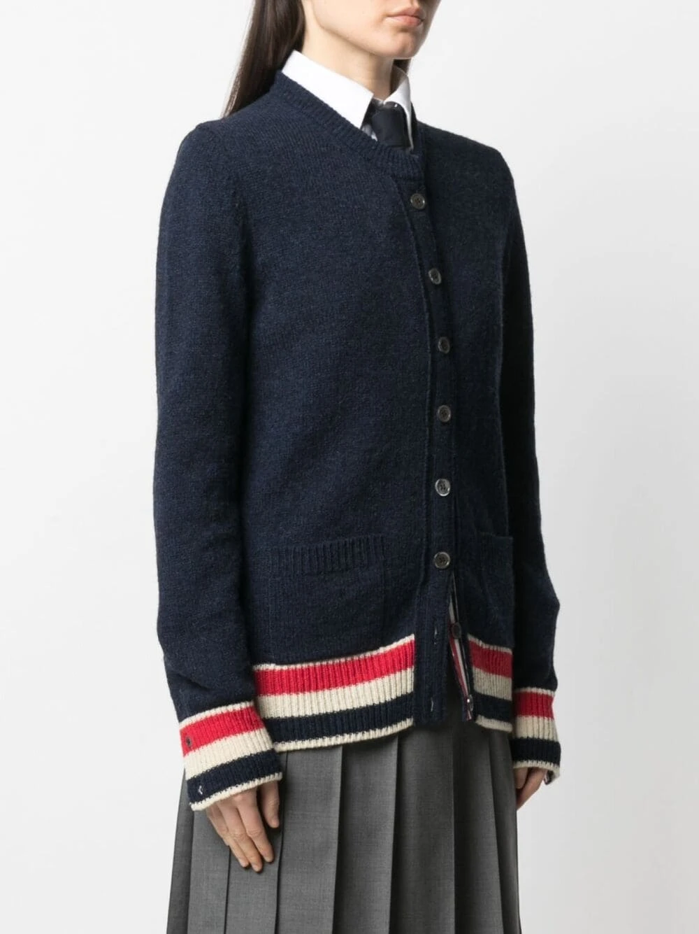 Next level knitwear. Boasting a classic round neck and the label’s signature RWB stripe at the hem, this chunky knit cardigan by Thom Browne is a welcome addition to any winter wardrobe.