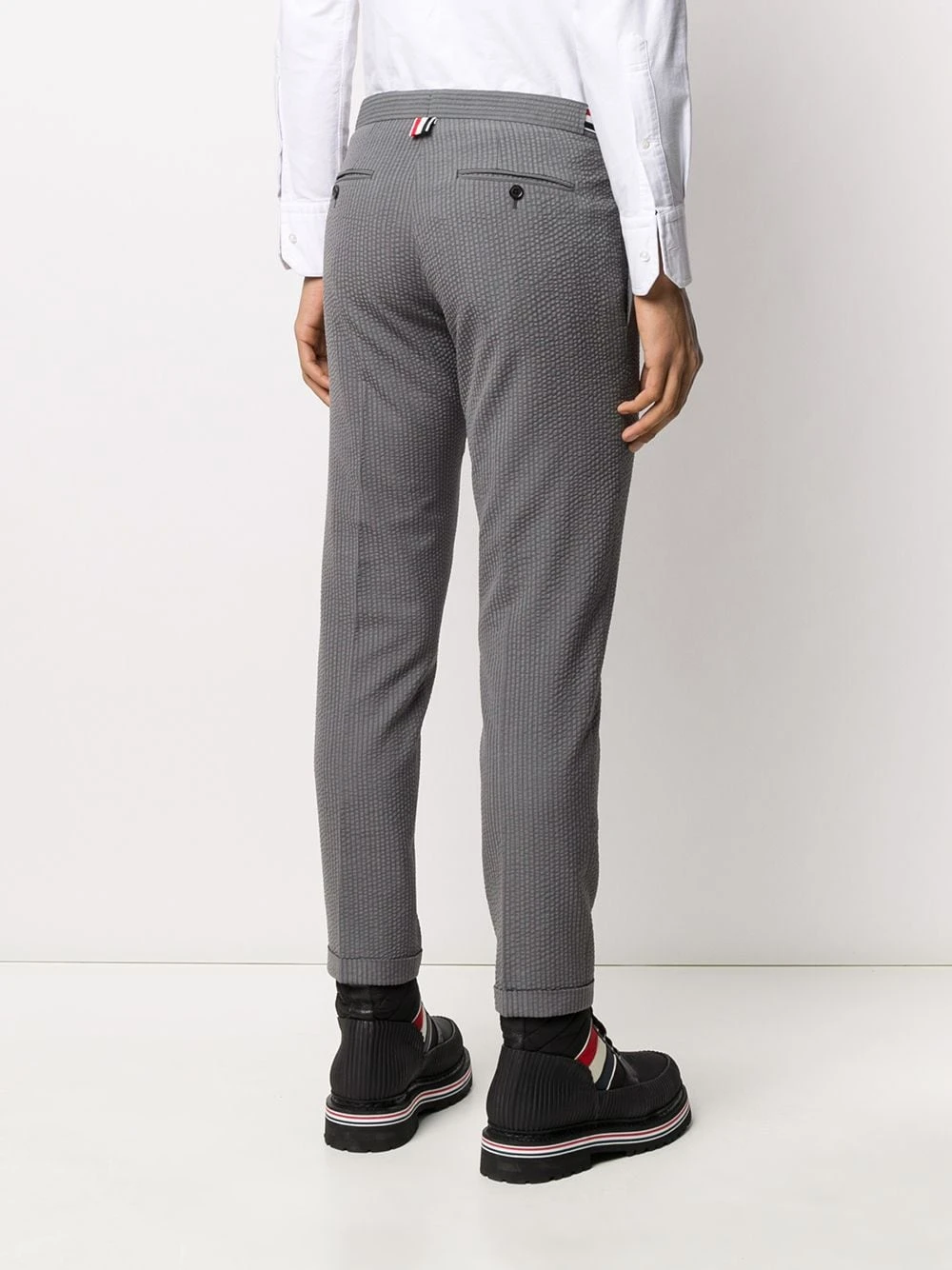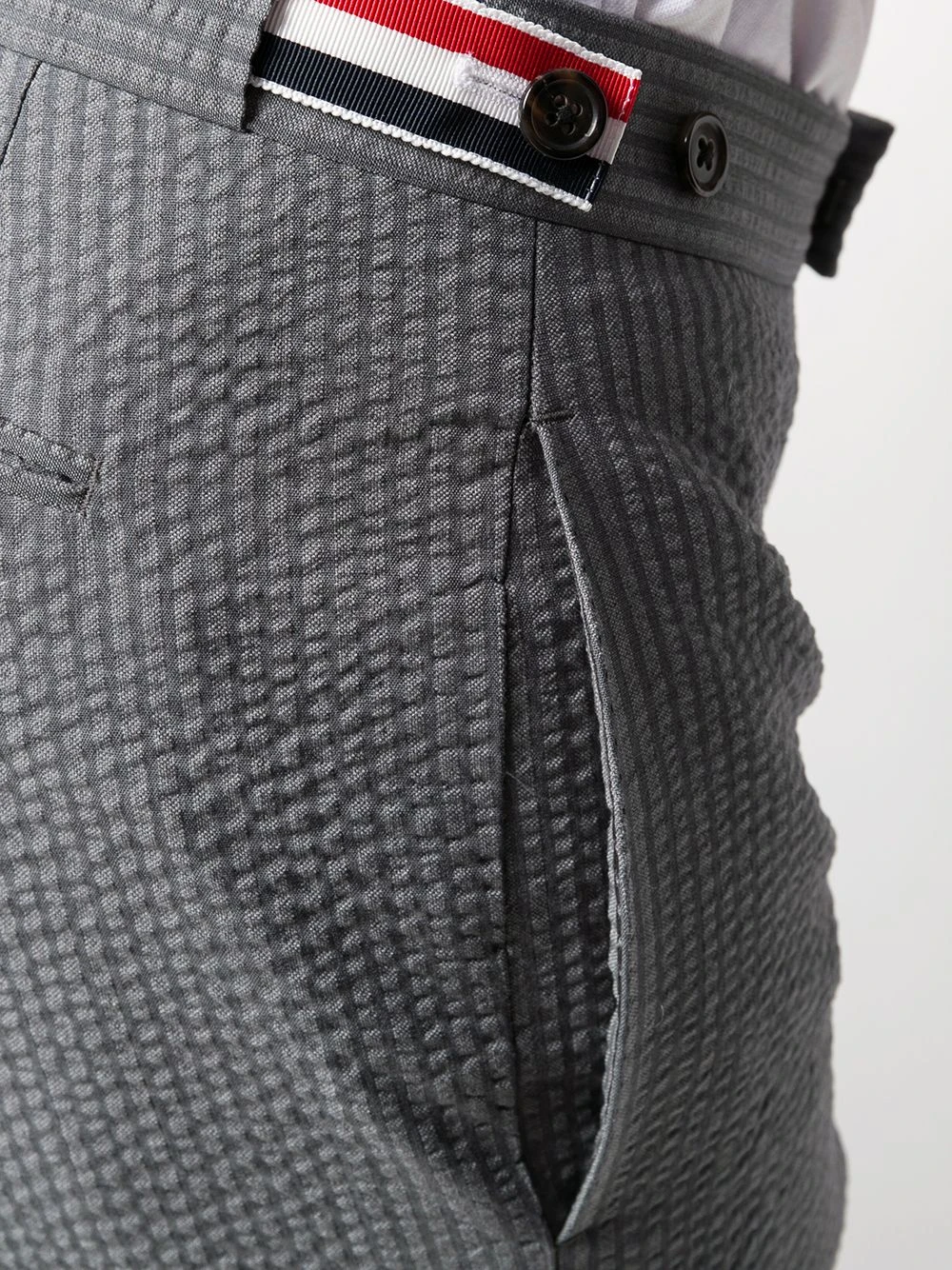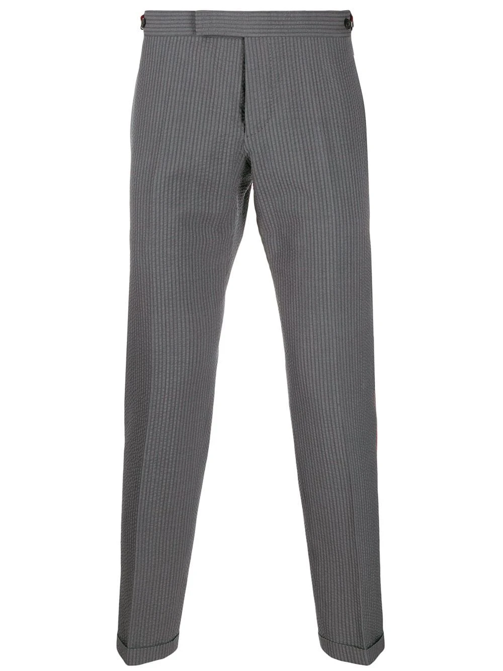Casual Fridays are a thing of the past. These dark grey wool seersucker low-rise trousers from Thom Browne will make you want to suit up every day of the week. Show them you mean business. Featuring a concealed front fastening, a slim fit, a low rise, a textured style, two back buttoned welt pockets, side slit pockets, a side button fastening and a signature tri-colour striped trim.