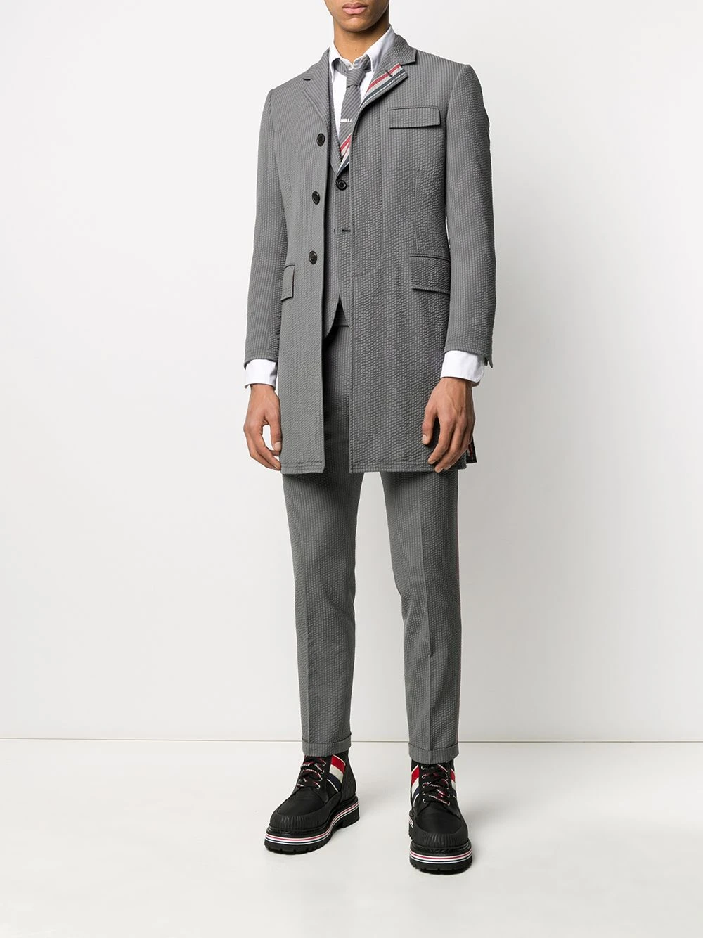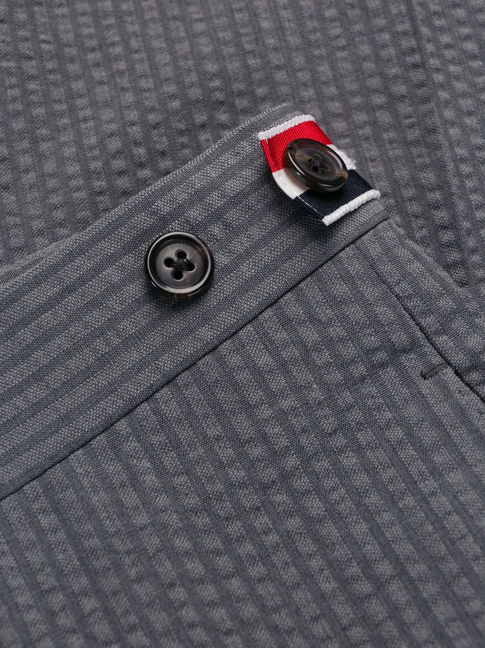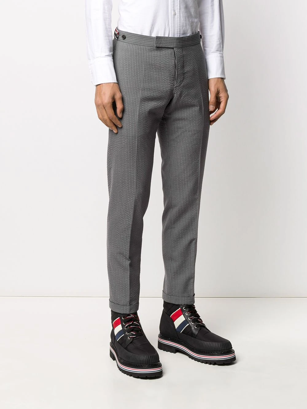 Casual Fridays are a thing of the past. These dark grey wool seersucker low-rise trousers from Thom Browne will make you want to suit up every day of the week. Show them you mean business. Featuring a concealed front fastening, a slim fit, a low rise, a textured style, two back buttoned welt pockets, side slit pockets, a side button fastening and a signature tri-colour striped trim.
