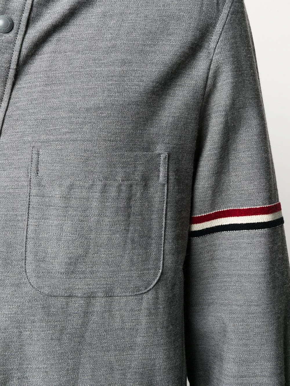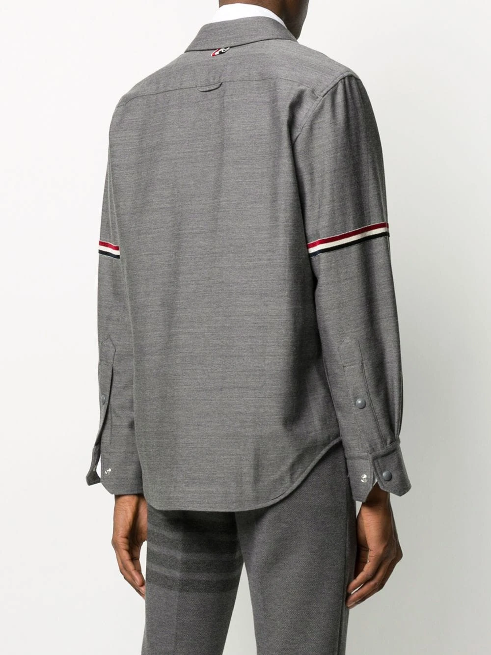 In my life I always ask this question: Am I the most powerful person in the room? With this medium grey wool-cotton blend suiting tricolour velvet stripe shirt jacket from Thom Browne you will be. Why fight it. Featuring a pointed collar, long sleeves, a chest pocket, a curved hem, snap button fasteners, a tricolour grosgrain tab on the rear and tricolour grosgrain details at the sleeves.