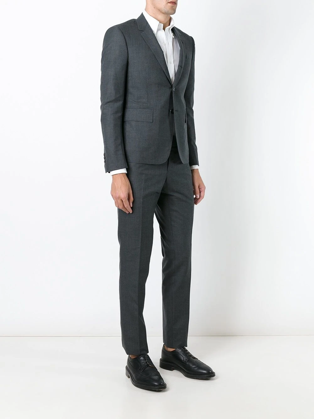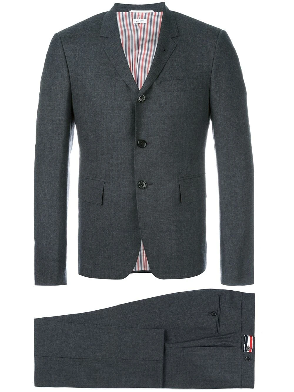 This grey suit bears all the hallmarks of Thom Browne, its single breasted silhouette crafted in a luxurious mohair blend wool. The jacket fastens with three buttons and is finished with notched lapels, welt pockets, buttoned cuffs, double vent and a striped tab to the rear, while the interior is fully lined with a striking striped fabric. The trousers take a straight cut, topped with a waistband, concealed fastening, side pockets, buttoned welt pockets and a tri-stripe patch.