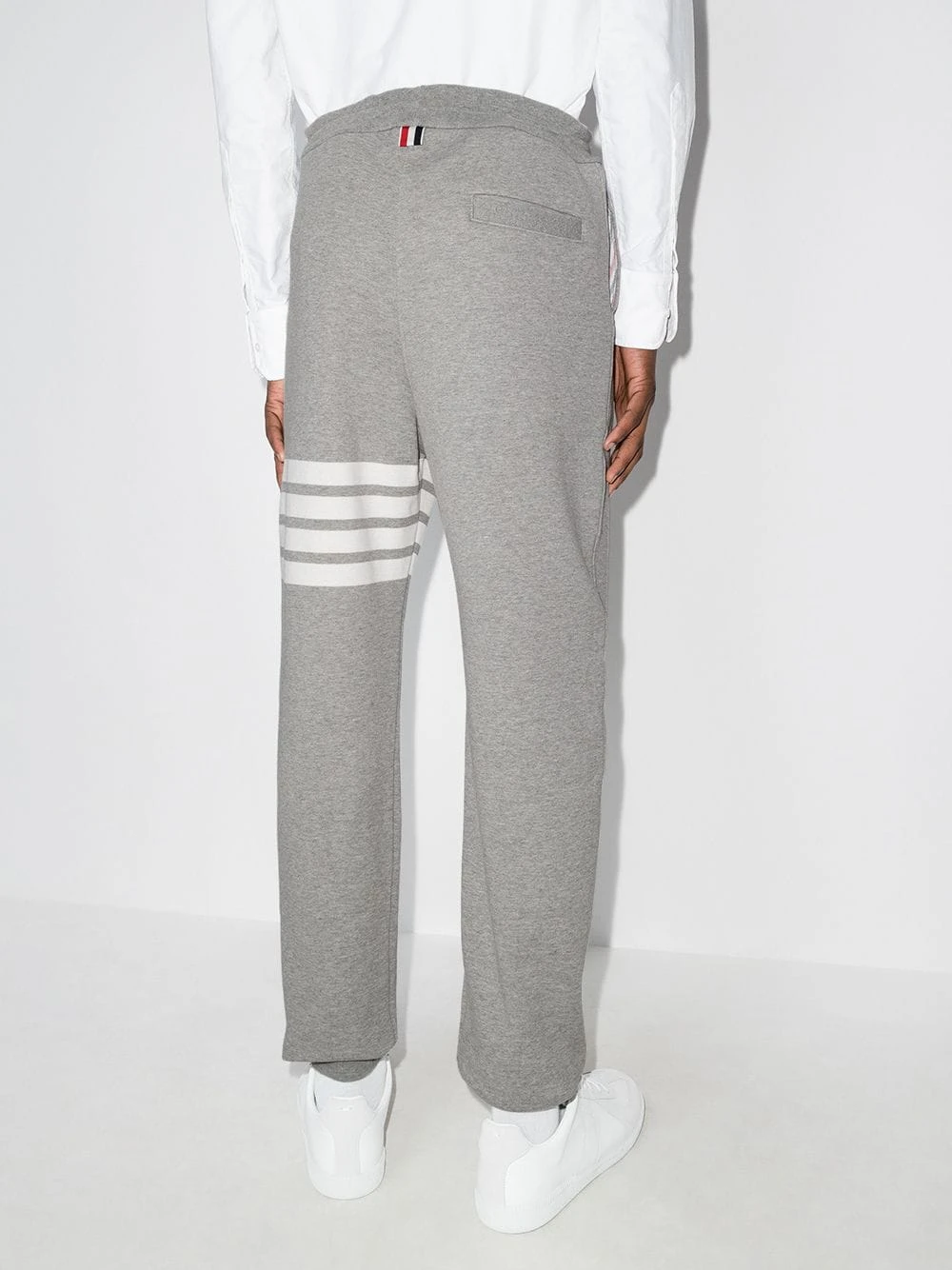 Comfort is key – but style is always appreciated, too. Crafted from cotton, these grey and white track pants from Thom Browne are decorated with a front logo patch and the brand’s signature white, red and blue tag to the rear. The perfect go-to for a relaxed look. Featuring an elasticated waistband with a drawstring fastening, side slit pockets, a back pocket, horizontal stripes to the left leg, a relaxed fit, ribbed cuffs and a regular length.