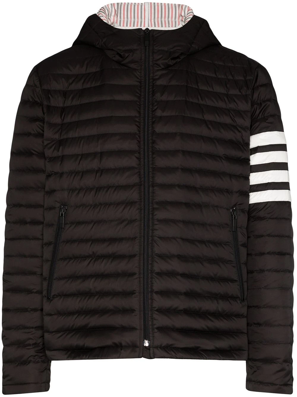 Keep yourself protected when the heavens open and it starts raining cats and dogs outside. Head out in this black 4 stripe padded jacket from Thom Browne and don’t let the weather get you down. Featuring hooded, a front zip fastening, front zipped pockets, a relaxed fit and long sleeves.