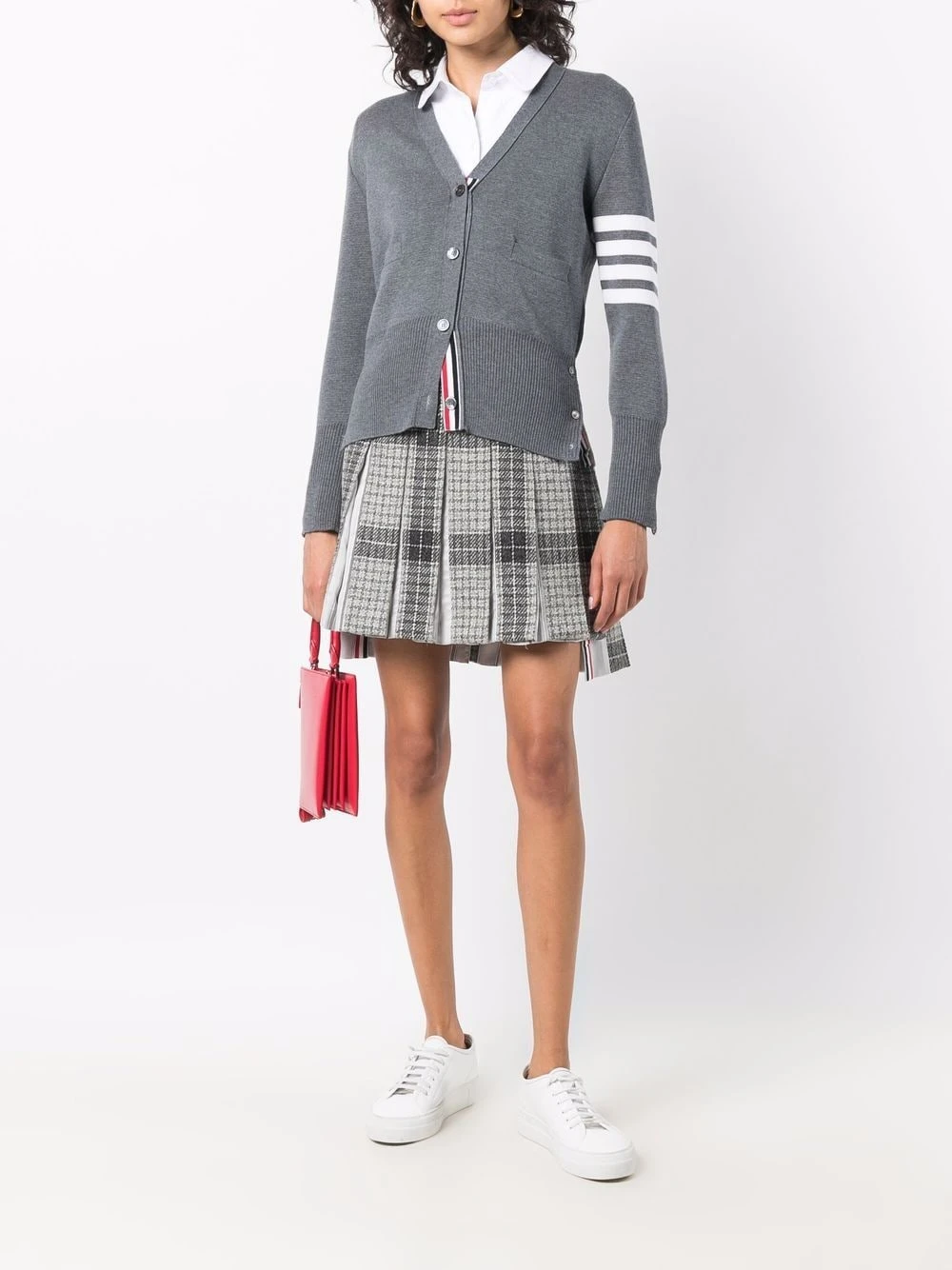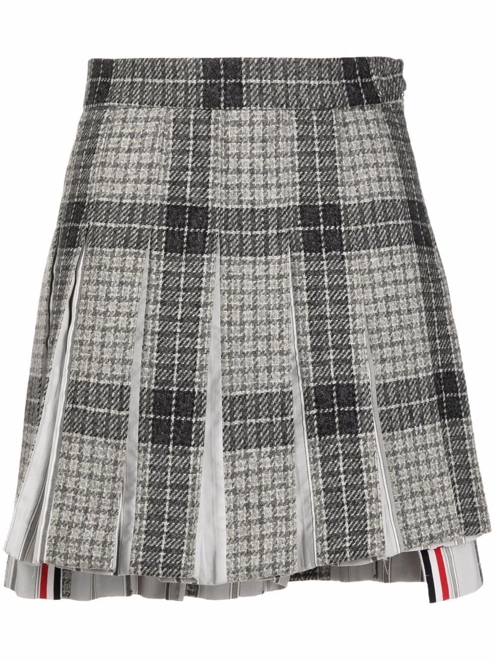 Thom Browne’s ability to transform a classic design into a contemporary piece is showcased here. Crafted in silk and wool, this timeless check pleated skirt is elevated with its modern high-low hem.