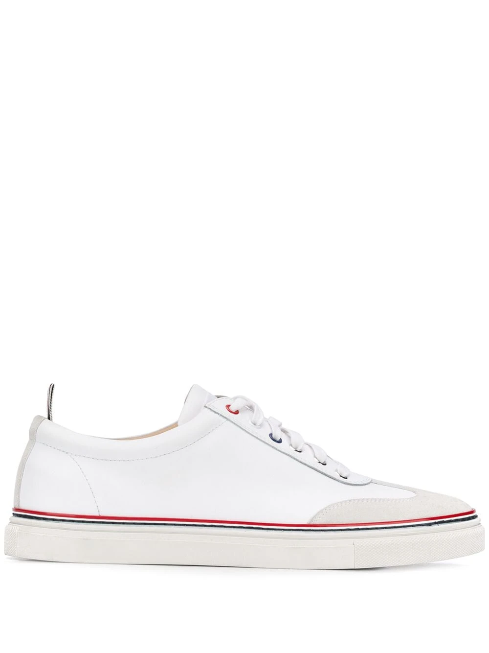 Thom Browne’s newest edit captures the immaculate craftsmanship and minimalist designs that have come to define the American label. Crafted from white leather, these rubberised sneakers feature a round toe with a contrasting suede toe cap, a lace-up front fastening, a flat rubber sole and a signature tri-colour striped trim.