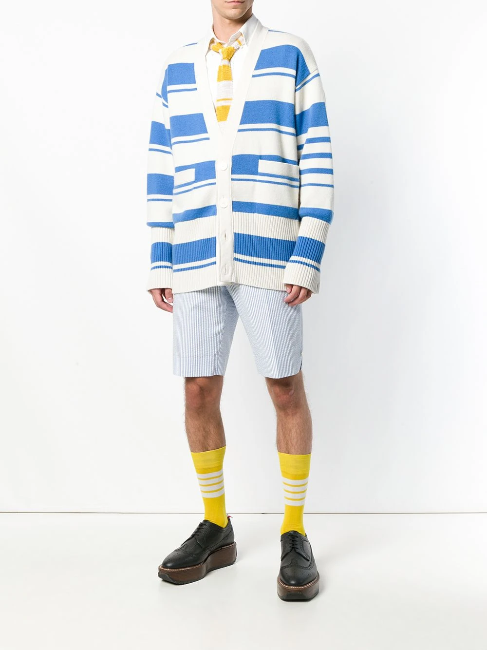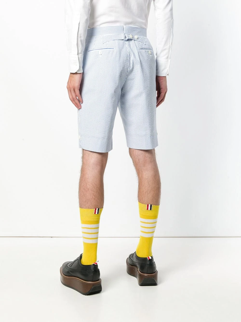 Light blue Seersucker Backstrap Short from Thom Browne featuring a mid rise, a slim fit, a striped pattern, a concealed front fastening, side pockets, two back buttoned welt pockets and a signature tri-colour striped trim.