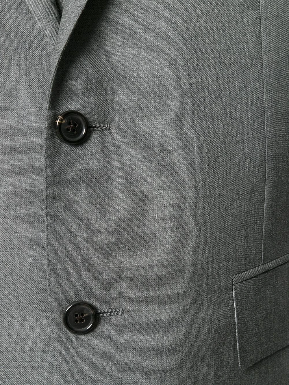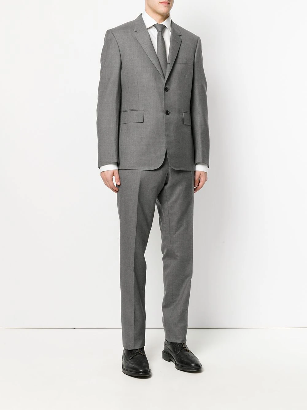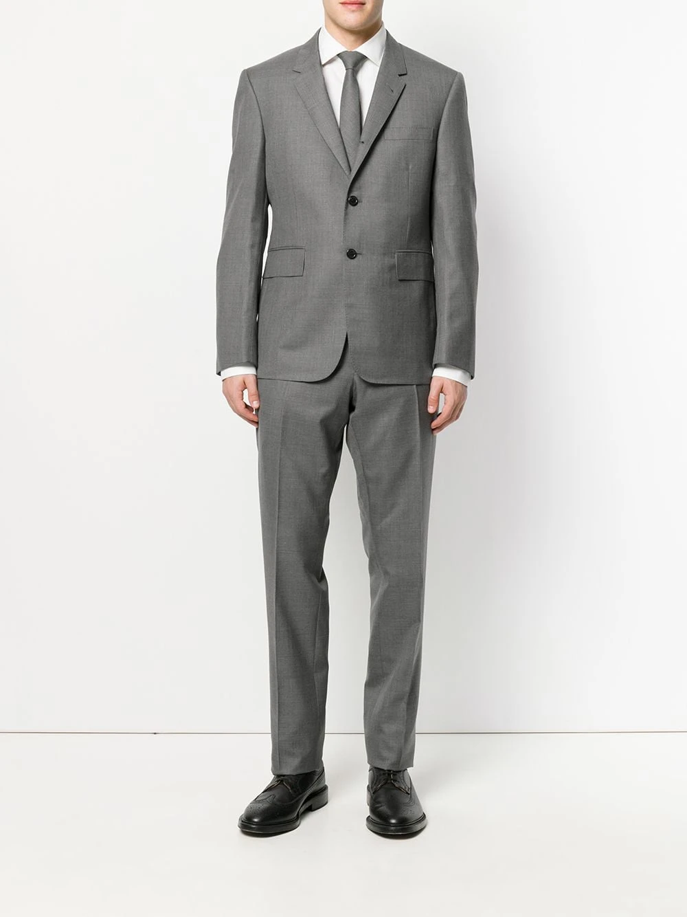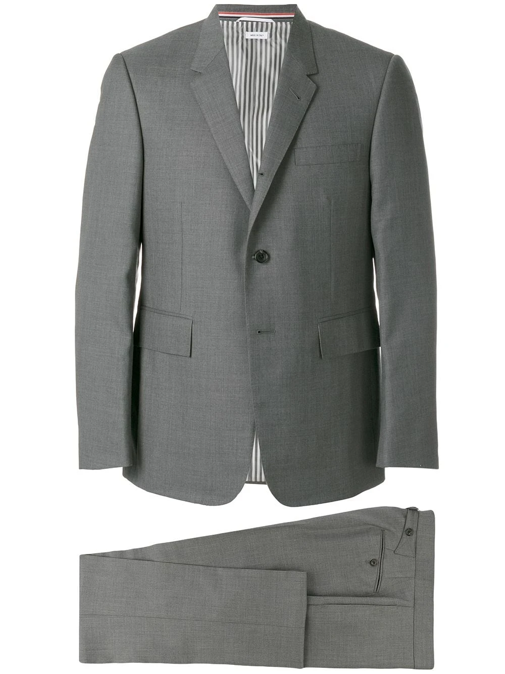 Want to make an impression? Look no further than this sophisticated single-breasted suit from Thom Browne. James Bond, take a seat. Featuring notched lapels, a broad welt chest pocket, a front button fastening, long sleeves, flap pockets, two back buttoned welt pockets, a straight leg, a regular length and a signature grosgrain loop tab.
