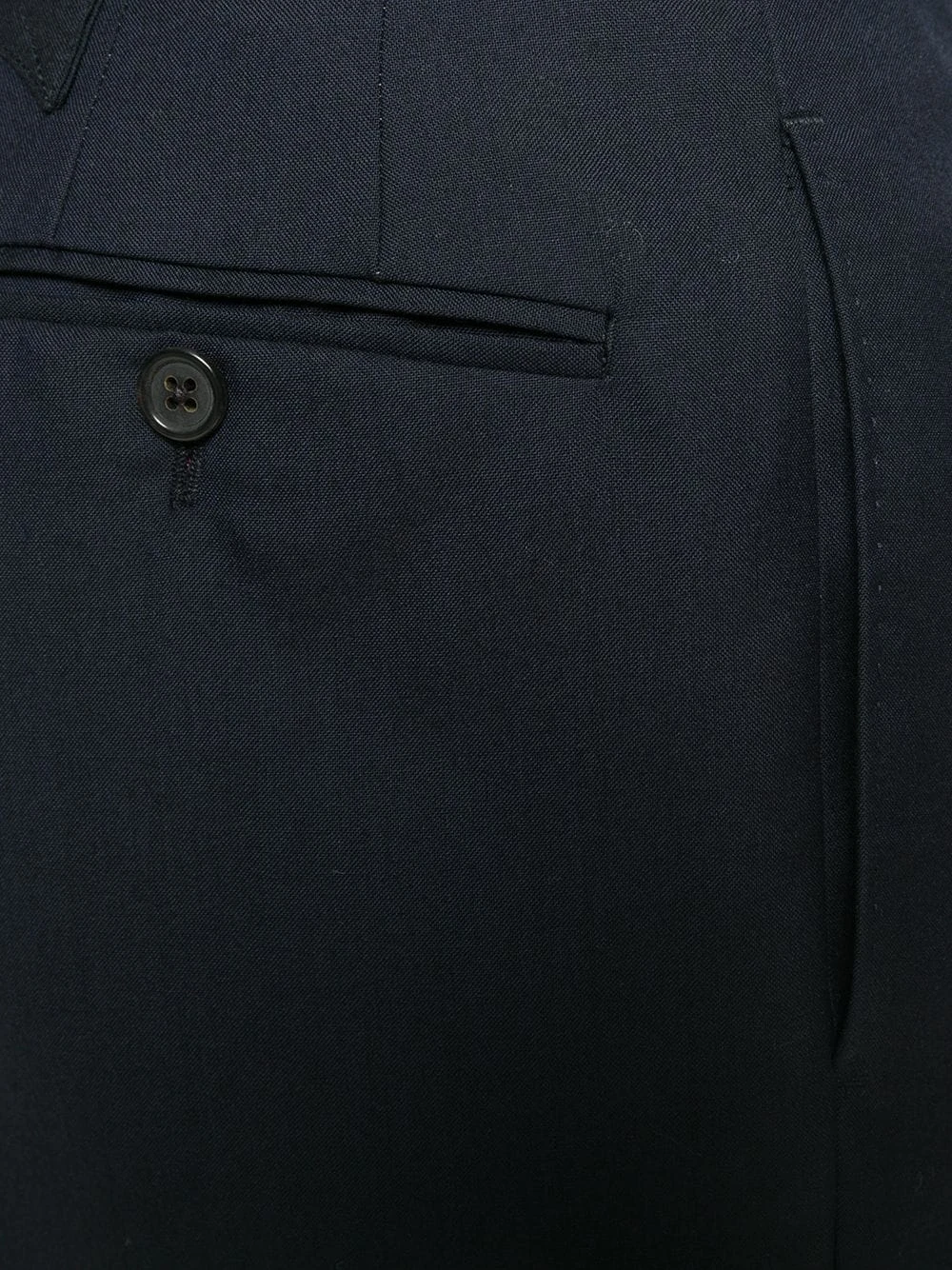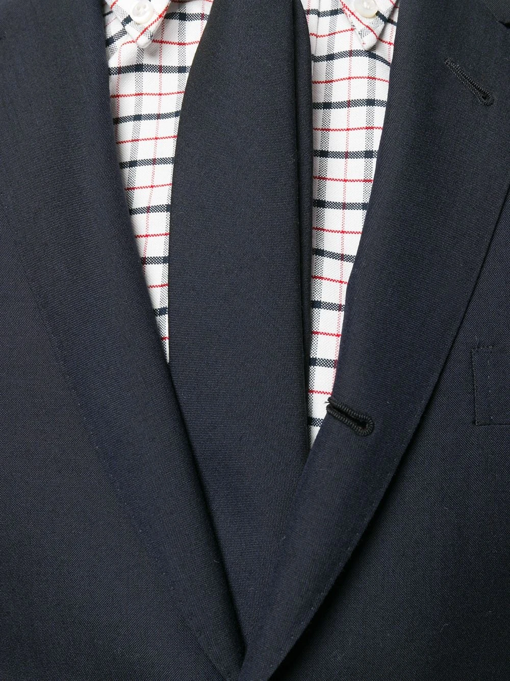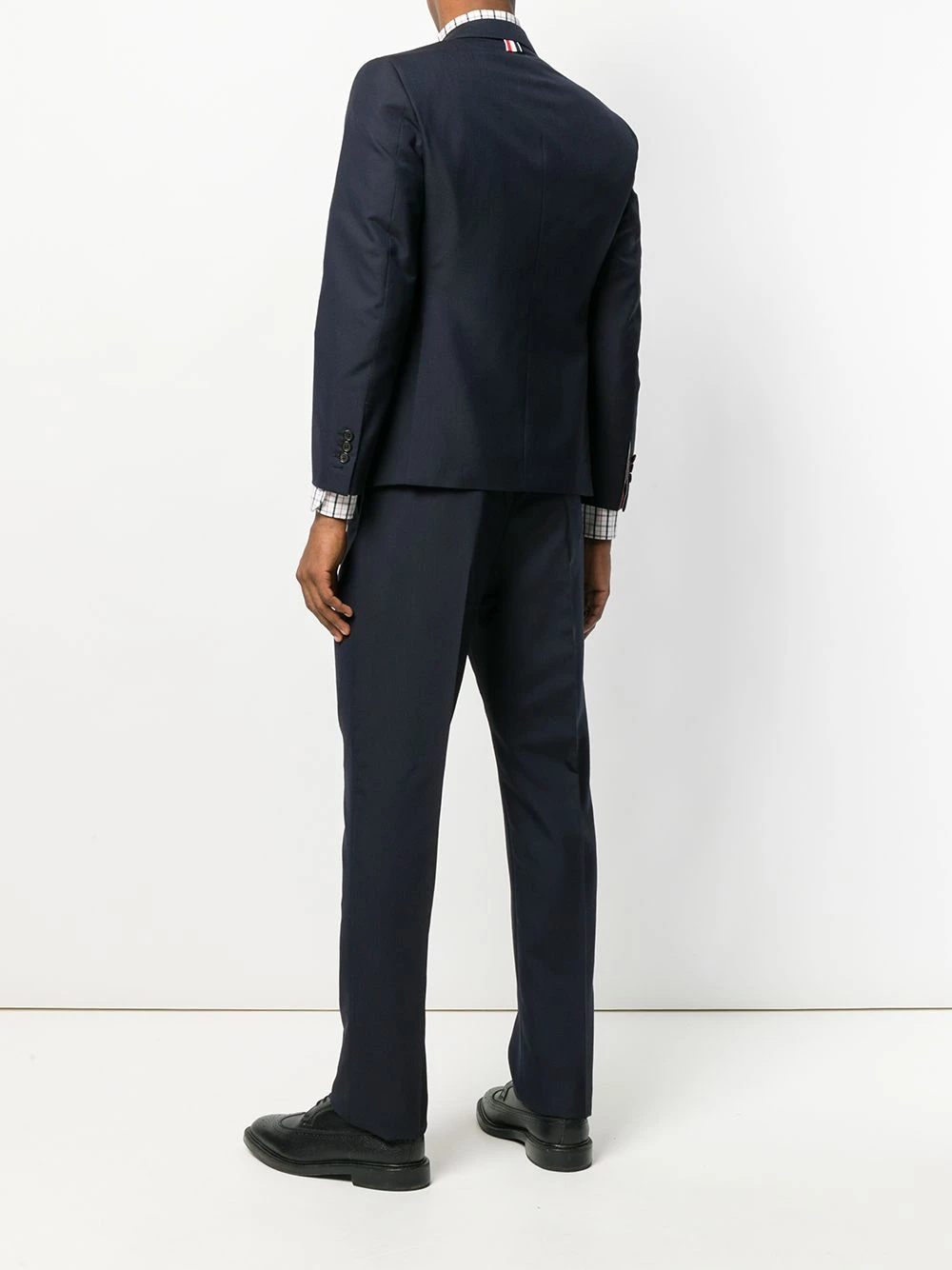 Navy blue wool Super 120s Plain Weave Suit from Thom Browne featuring notched lapels, cropped sleeves, button cuffs, a front button fastening, a broad welt chest pocket, front flap pockets, a double vent to the rear, a full lining, a hook and zip fly, side slit pockets, two back buttoned welt pockets, a tailored design and a regular length.