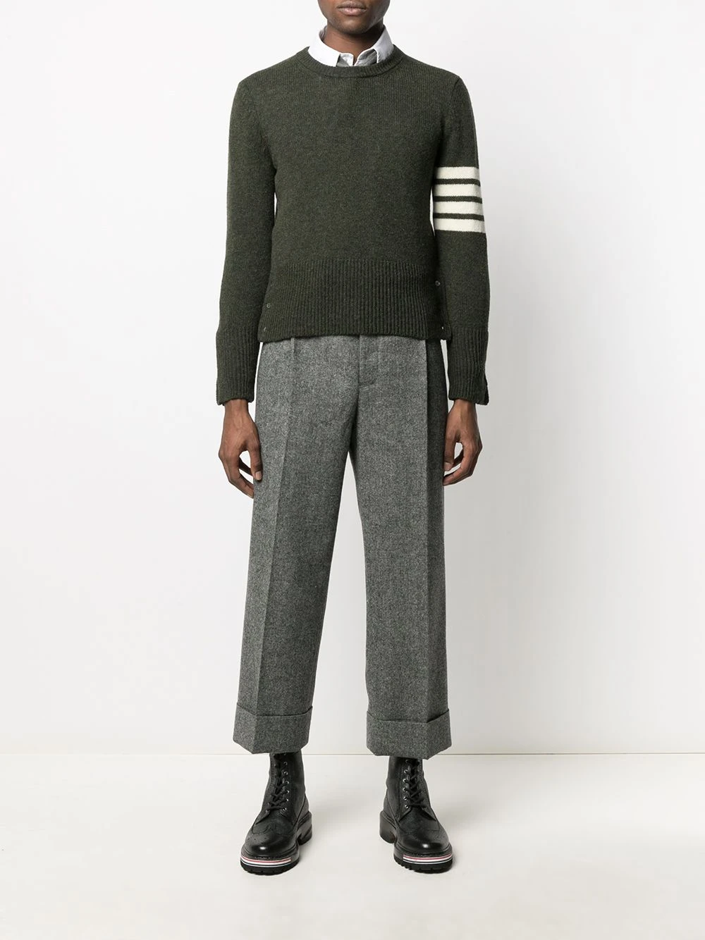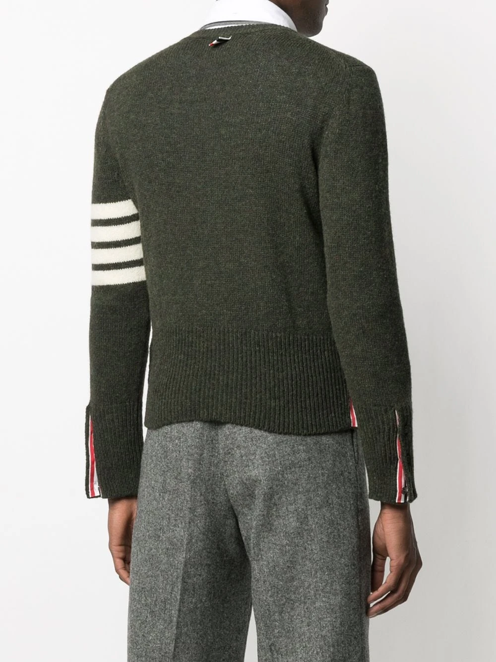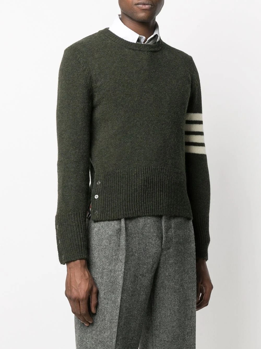 A preppy piece that packs a punch. In a dark green hue and wool construction, this jumper from Thom Browne boasts a 4-Bar motif design and chunky knit. Baby it’s cold outside, so wrap up in Thom Browne.