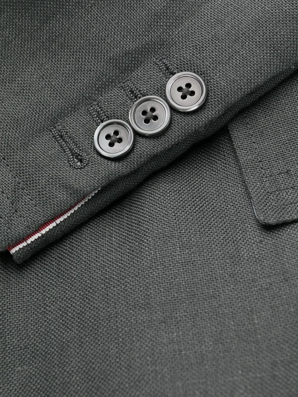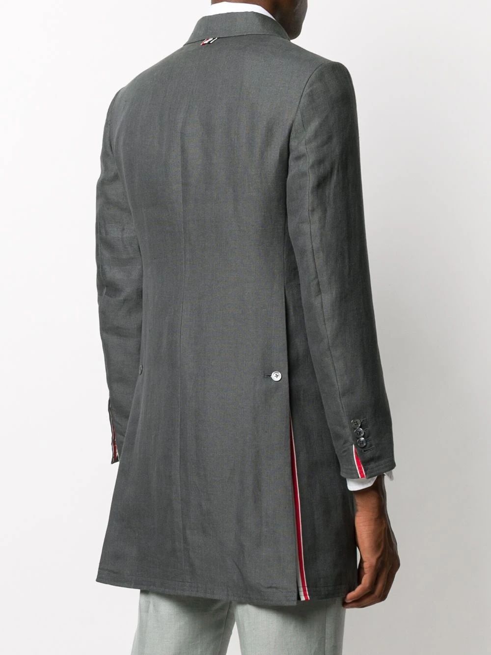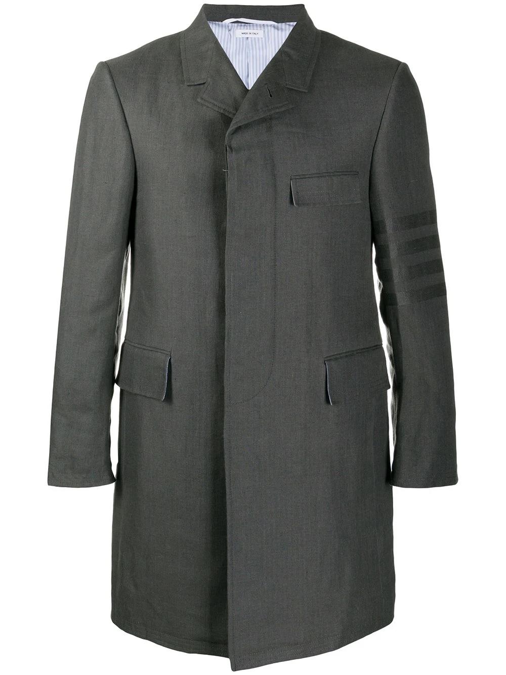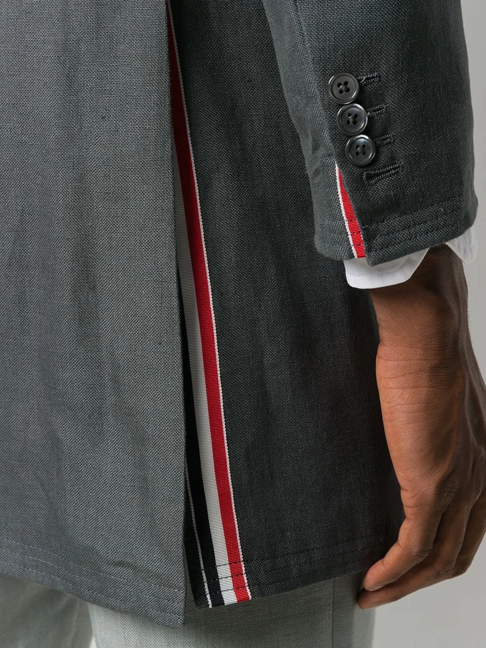 Comfortable and classic. You can’t go wrong with a tailored coat, especially when it comes from a soft knit like this linen 4-Bar engineered coat from Thom Browne. Invest in a staple.