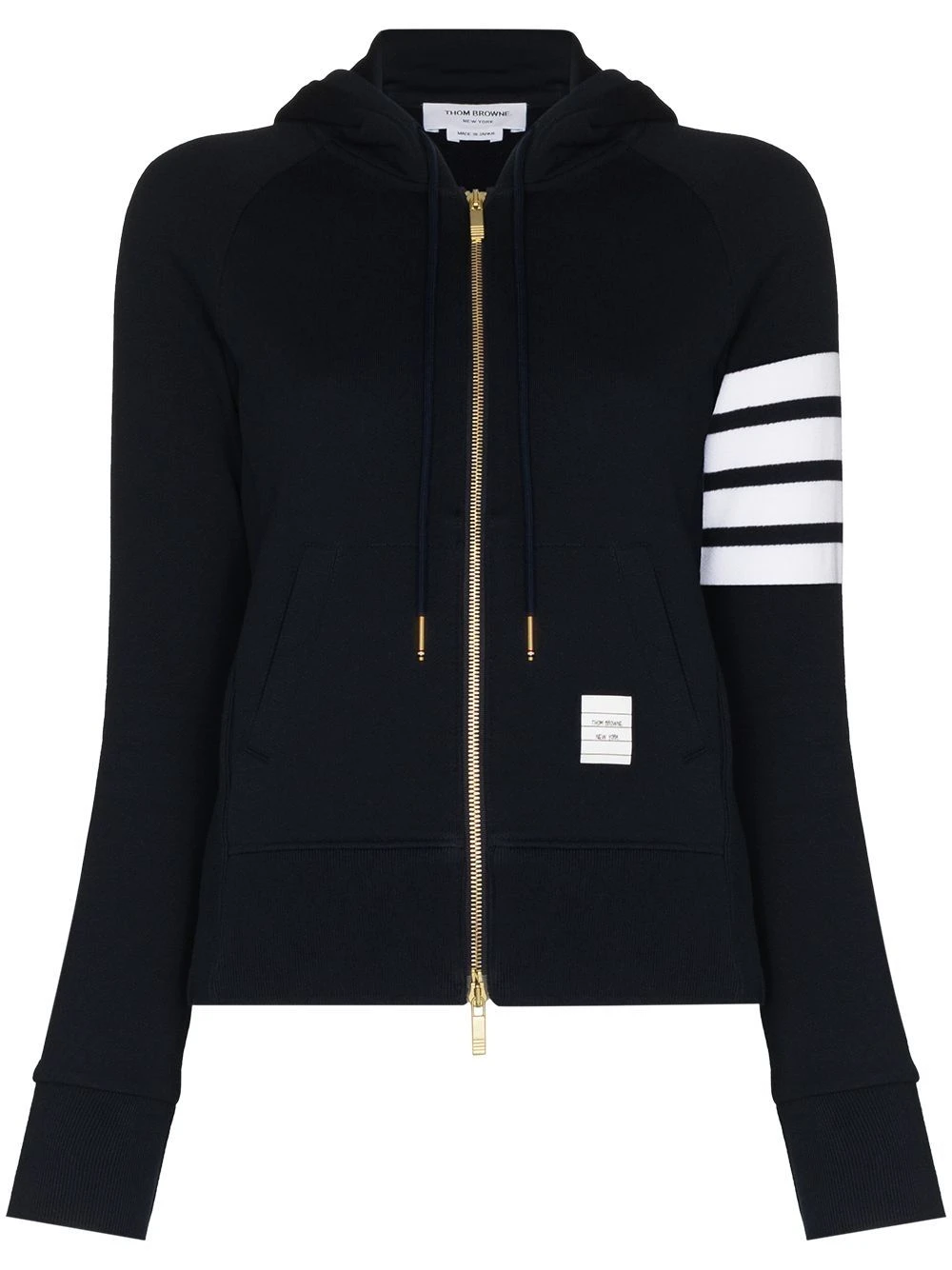 Embrace a sporty aesthetic in the sleekest way possible. This navy blue cotton engineered 4-Bar stripe zip-up hoodie from Thom Browne is your answer to laid-back Sundays. Comfort never looked so good. Featuring a drawstring hood, a front zip fastening, long sleeves, two front pockets, a front logo patch, a ribbed hem and cuffs and 4-Bar stripes to the sleeve.