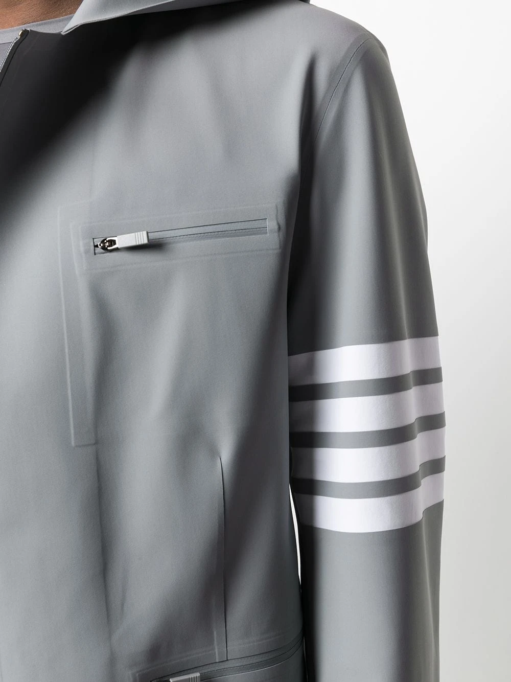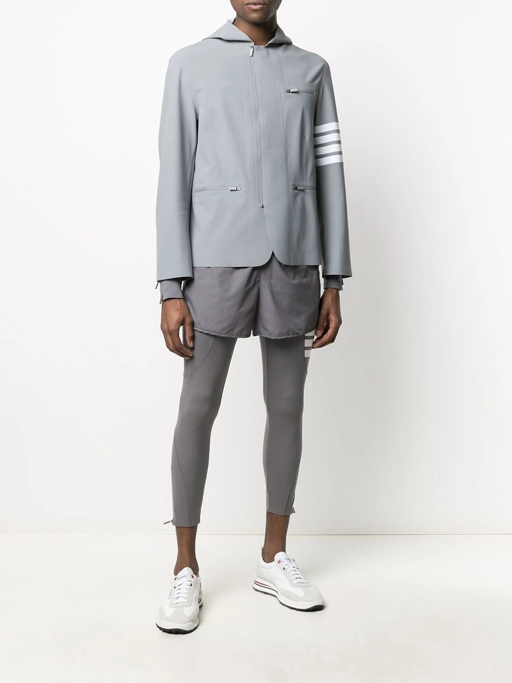 You can’t control the weather, right? But you can make sure it doesn’t get in the way of your outdoors exercising with this weather-proof hooded compression jacket by Thom Browne. Come rain or shine.