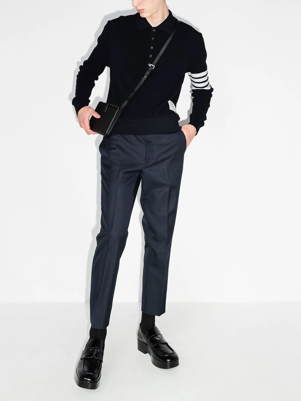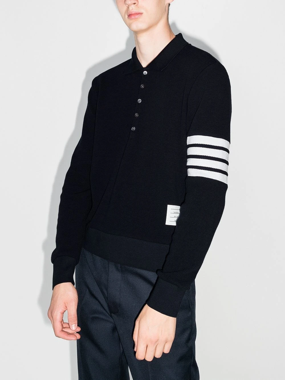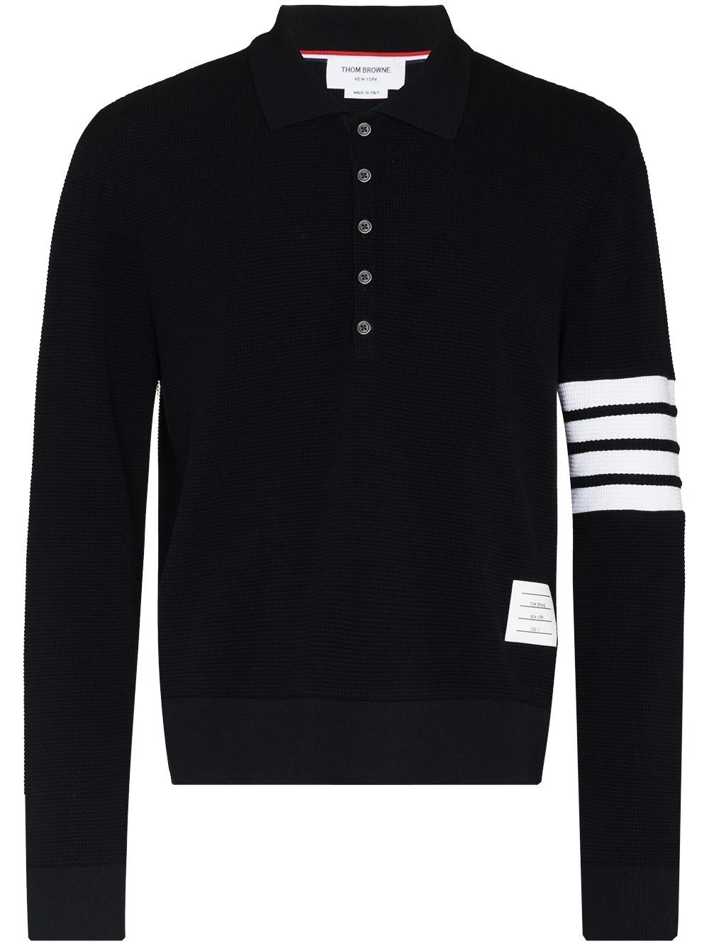 An iconic symbol of the Thom Browne house, the 4-Bar Stripe is seen in every collection. For AW21, itβs presented on its usual spot: the left upper arm of this long-sleeved polo shirt.