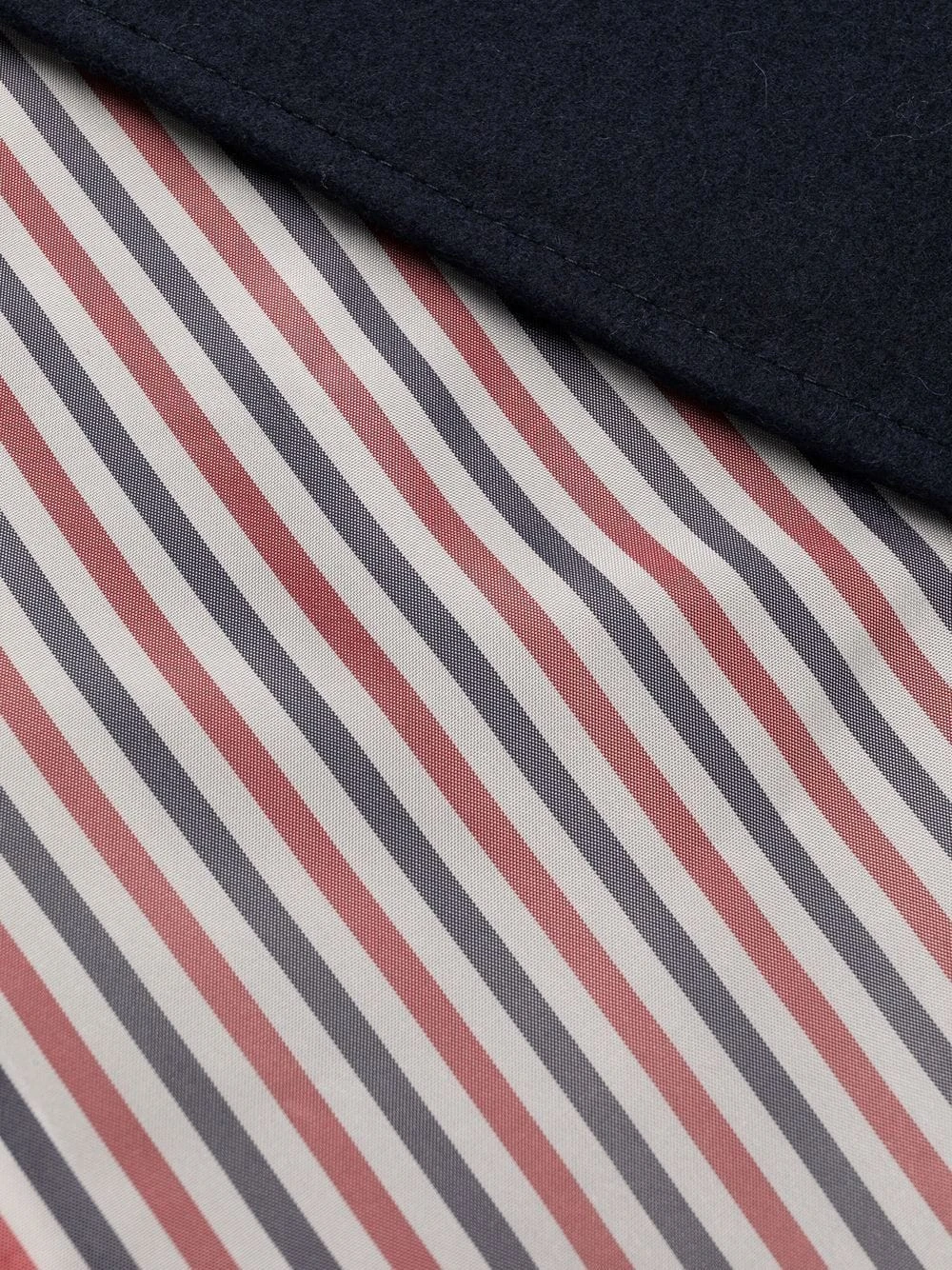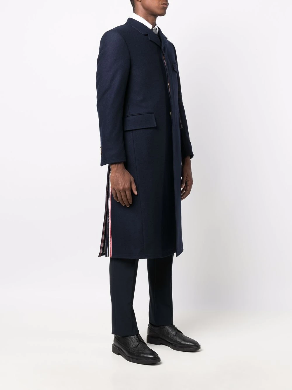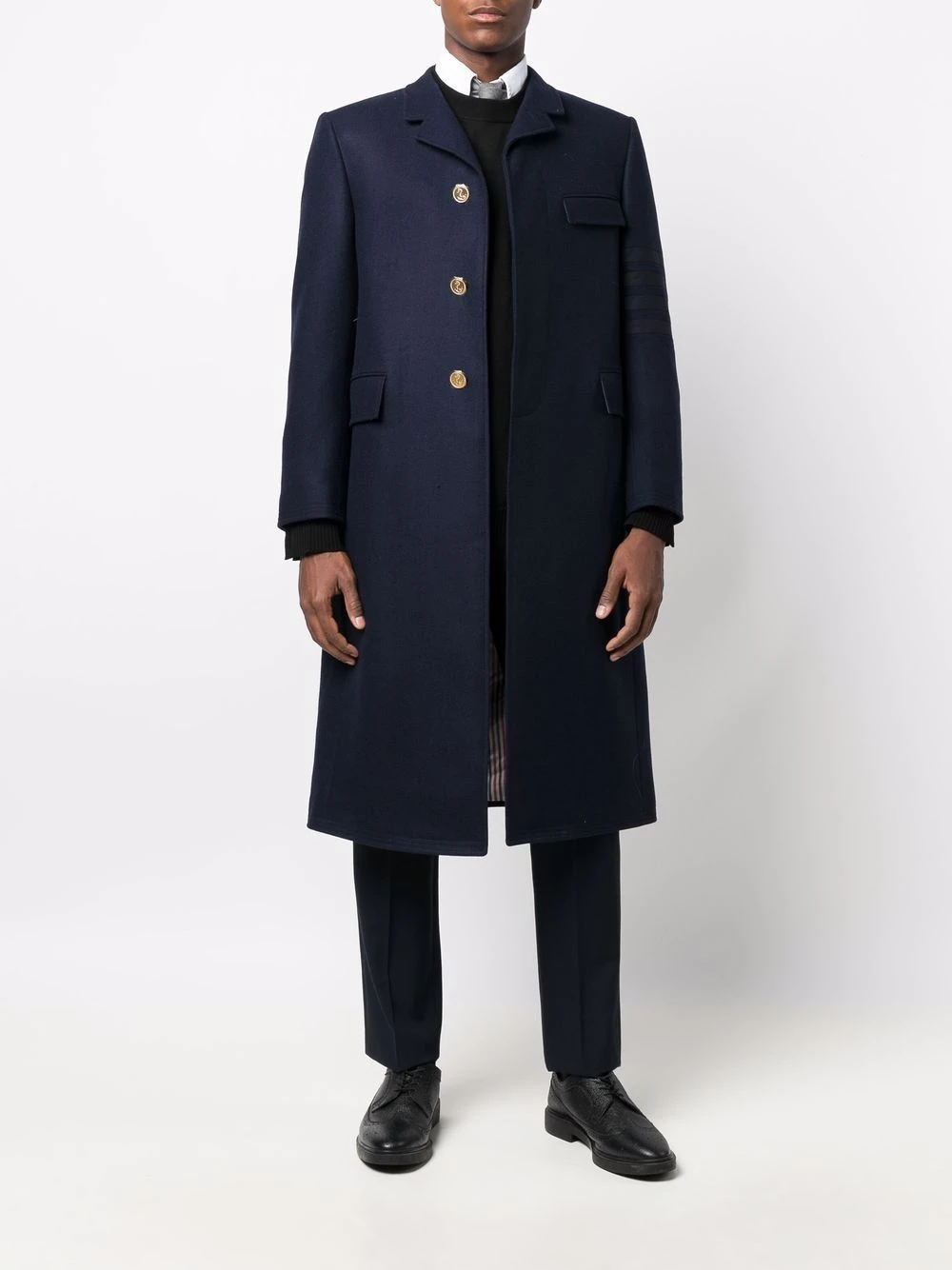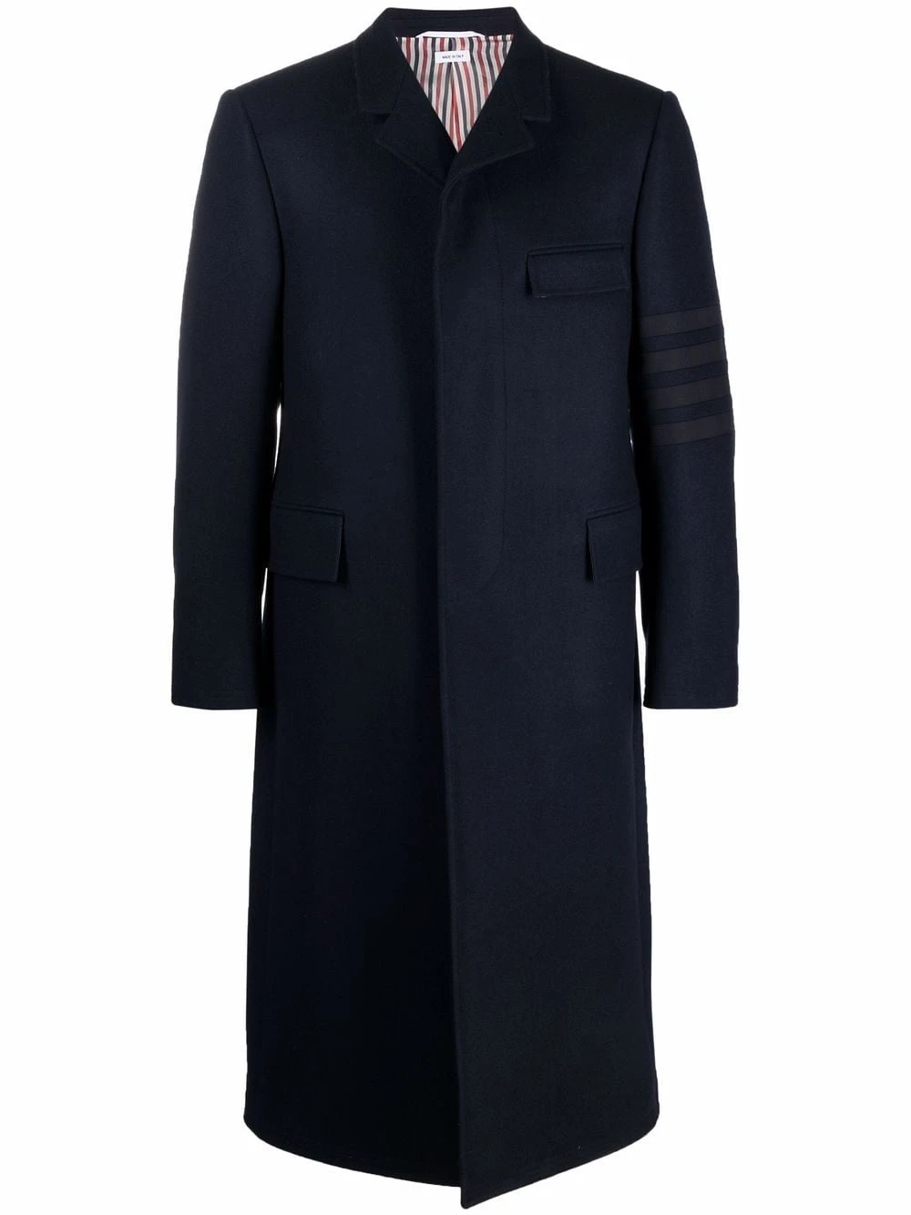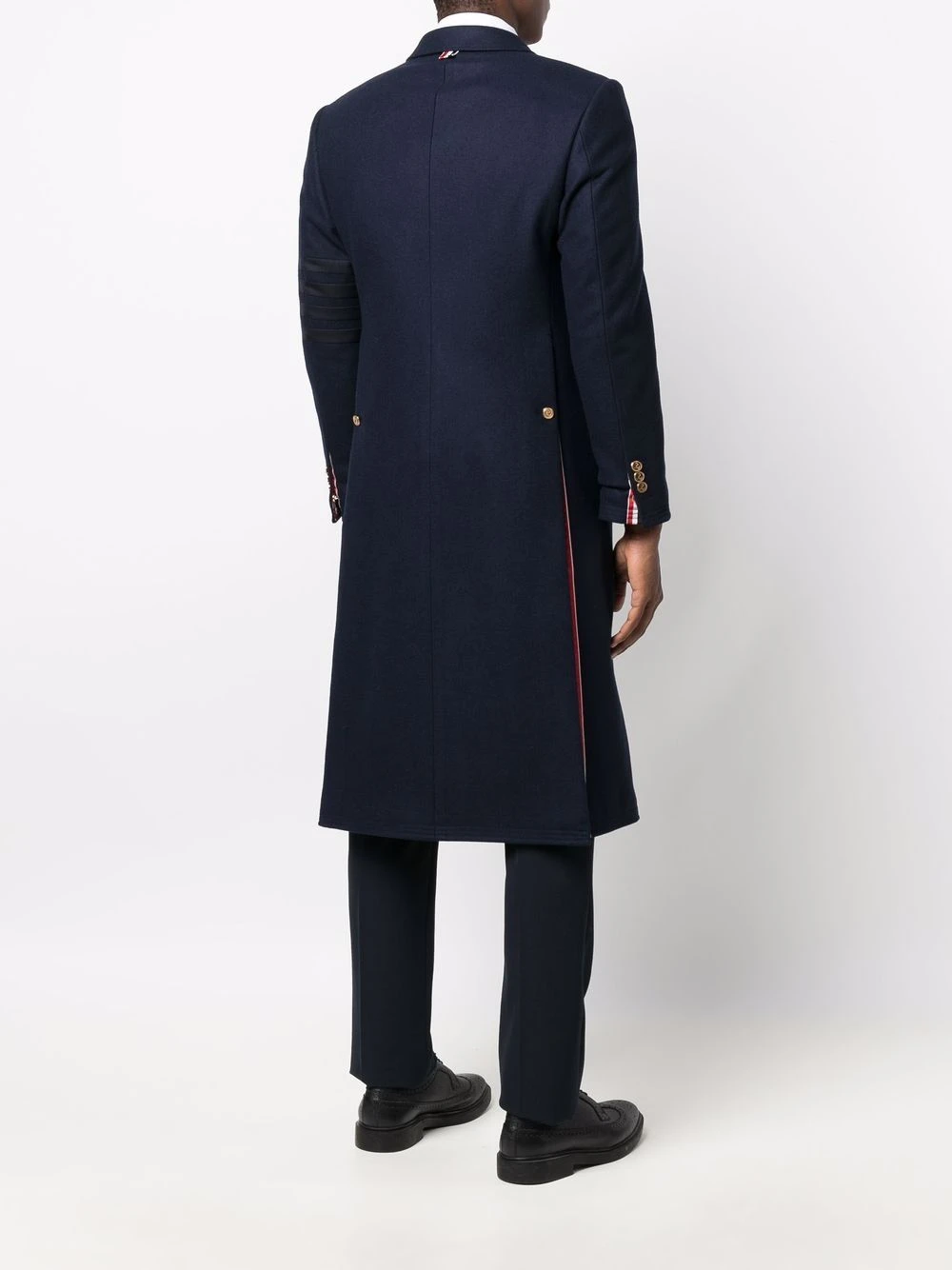 Thom Browne uses collegiate undertones and signature motifs to design the modern tailored pieces. This classic midi coat features a distinguishing 4-bar stripe detail on the sleeve and an iconic RWB stripe to the rear.