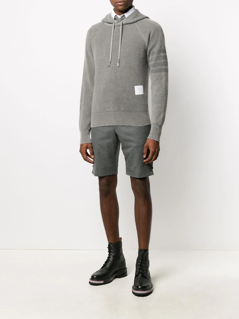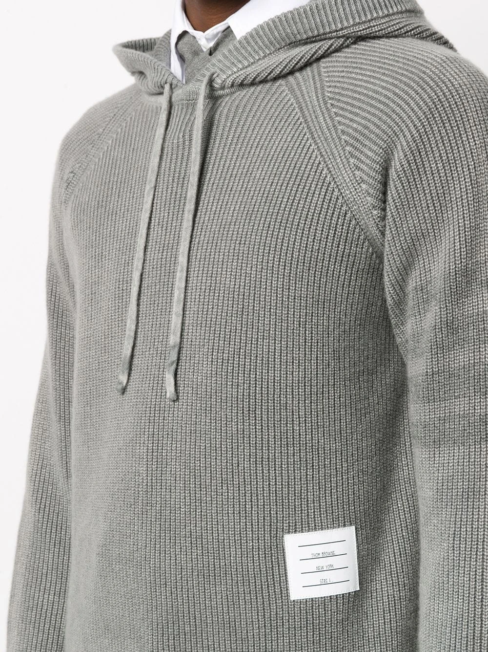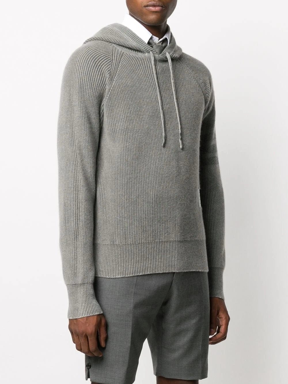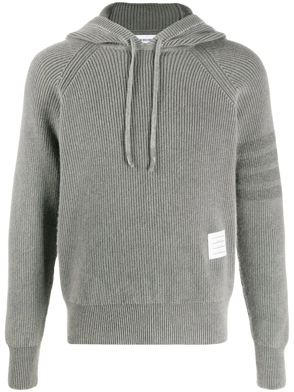 It’s a cashmiracle! This knitted cashmere hoodie from Thom Browne features the softest knit you will ever experience, crafted into a rib design. One sleeve sports a statement stripe, and the front of the piece proudly holds a logo patch to the front.