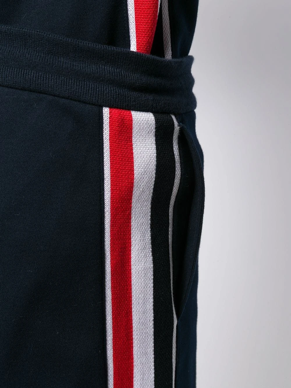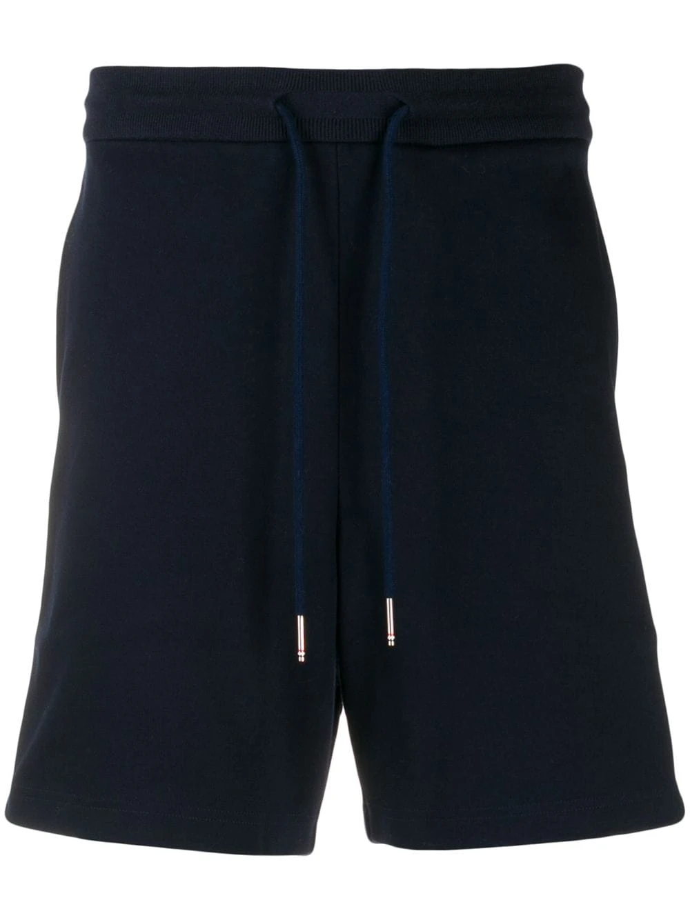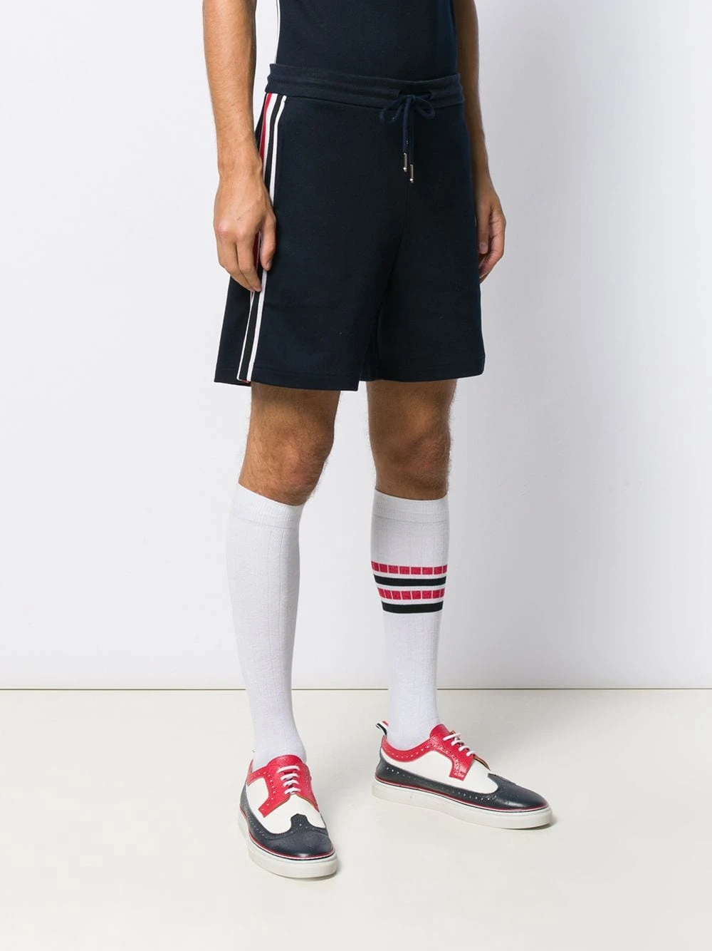Launched in 2003, Thom Browne is internationally celebrated for its clean-cut silhouettes and couture-like sensibilities, as seen in these navy blue cotton interlock RWB stripe shorts. Featuring an elasticated drawstring waist, a contrasting tape at the side and a contrasting grosgrain tab at the rear.