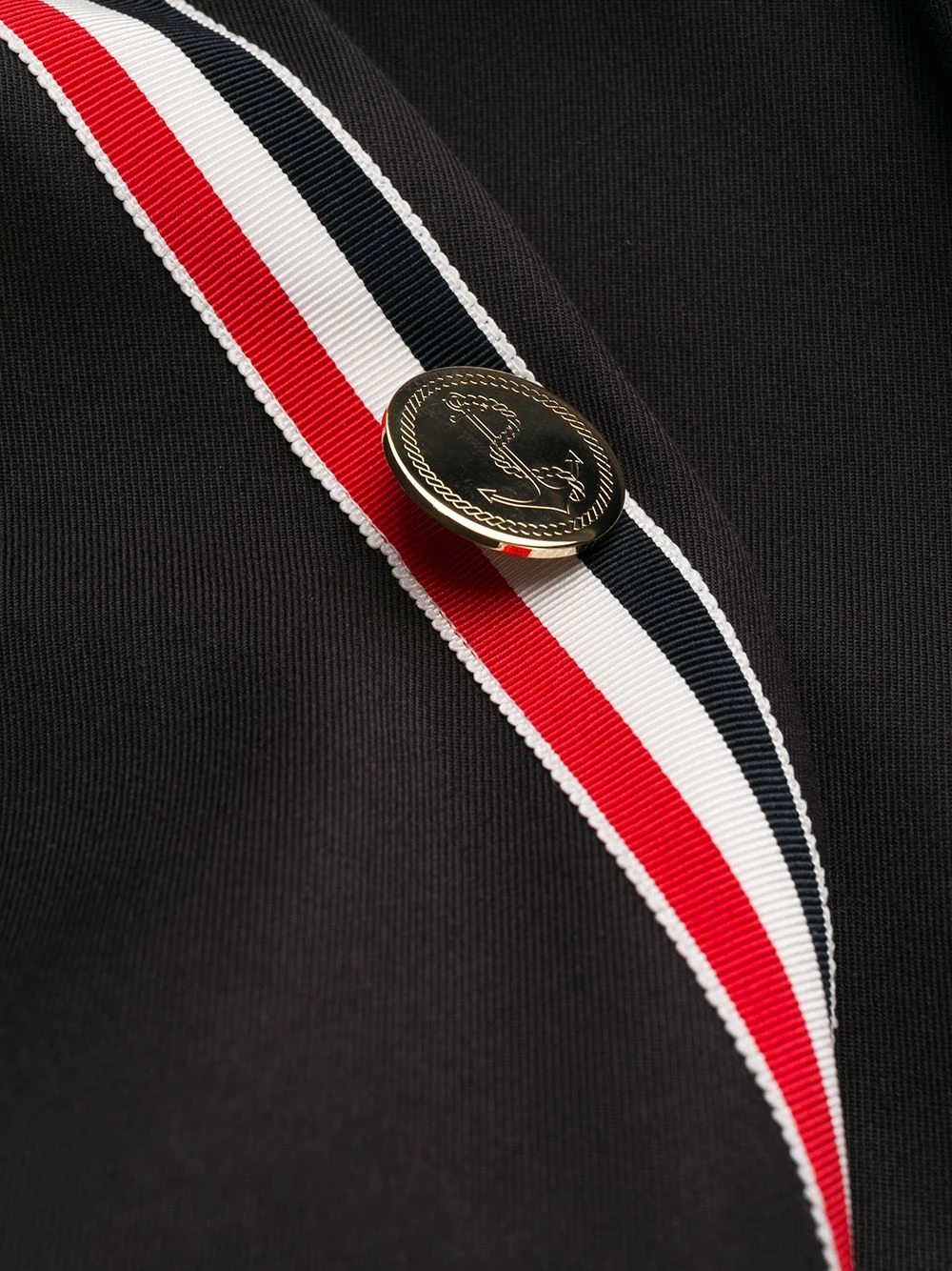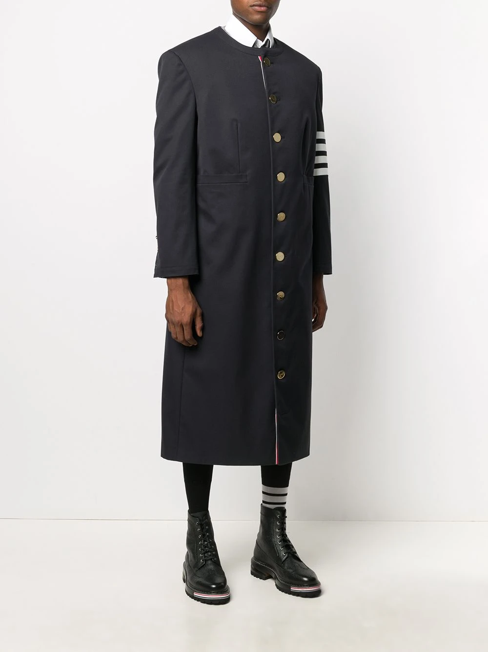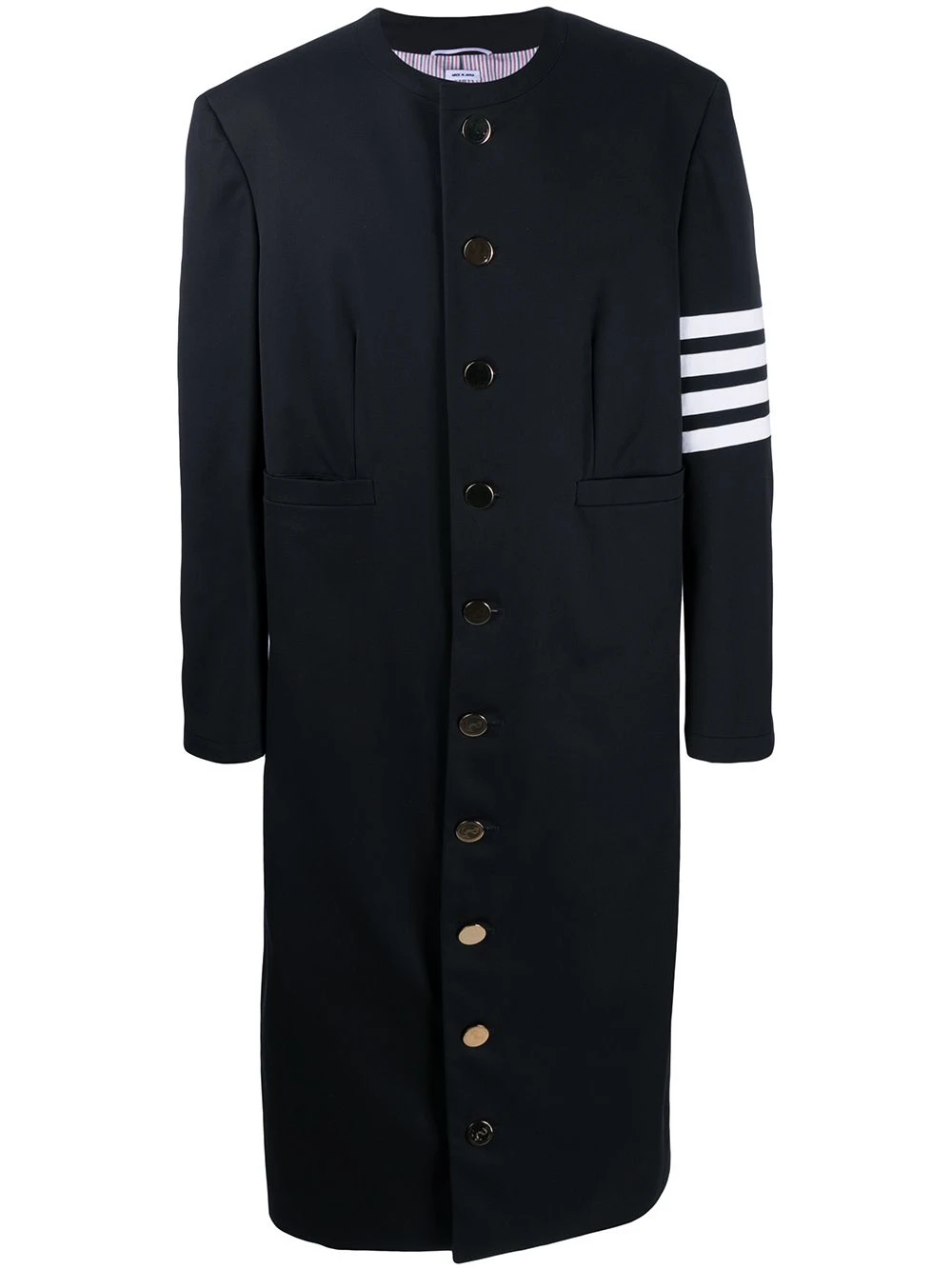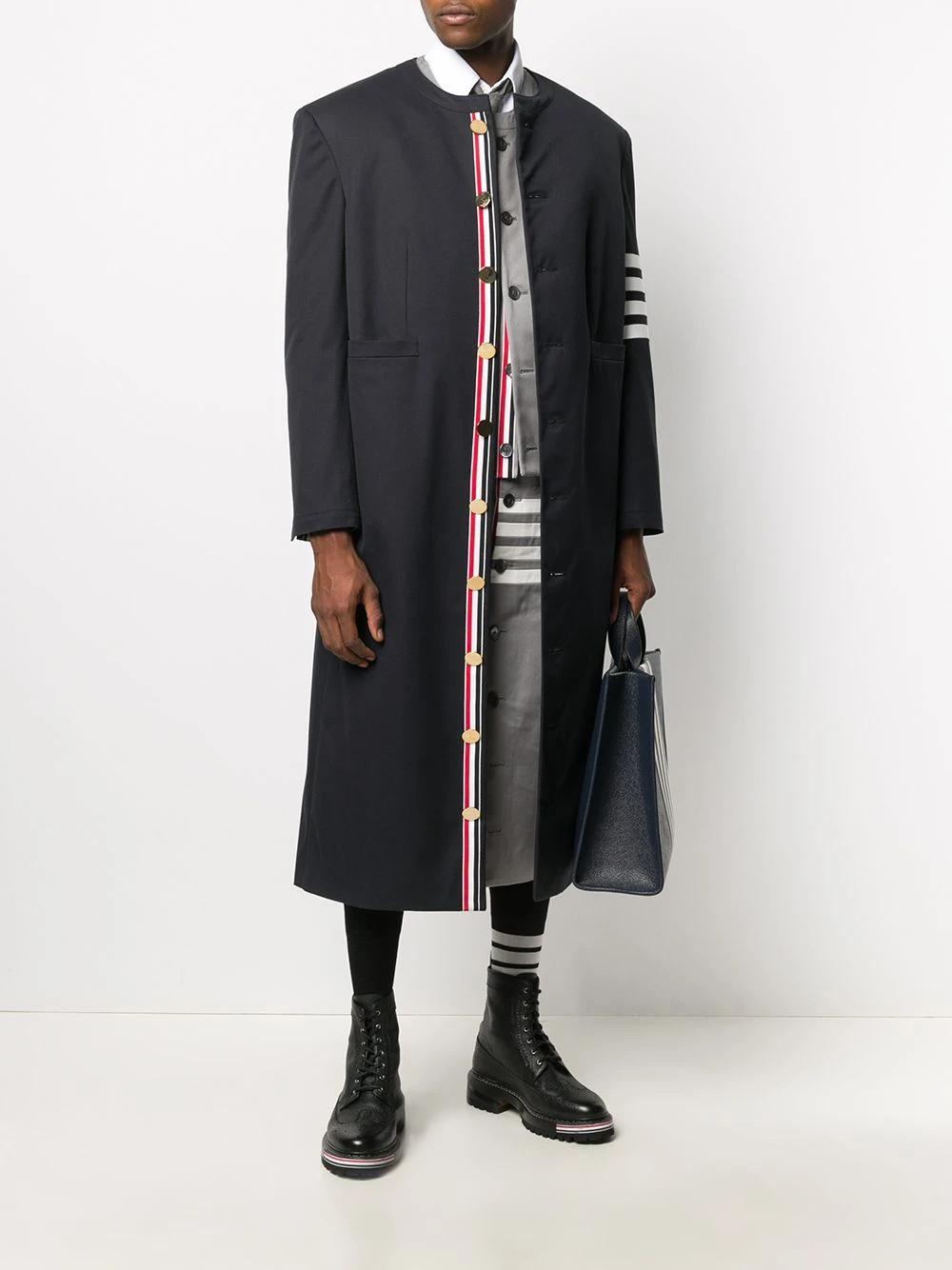 Show where your loyalties lie. Crafted from a navy cotton blend, this oversized 4-bar coat from Thom Browne proudly displays the siganture 4-bar logo for added detail. Say it loud.