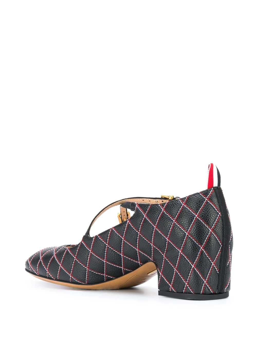 Don’t get cross – get cross-over! These black calf leather pumps from Thom Browne. They feature a quilted finish, contrast stitching, crossover strap detail, gold-tone hardware and low block heel. Fall in love this season.