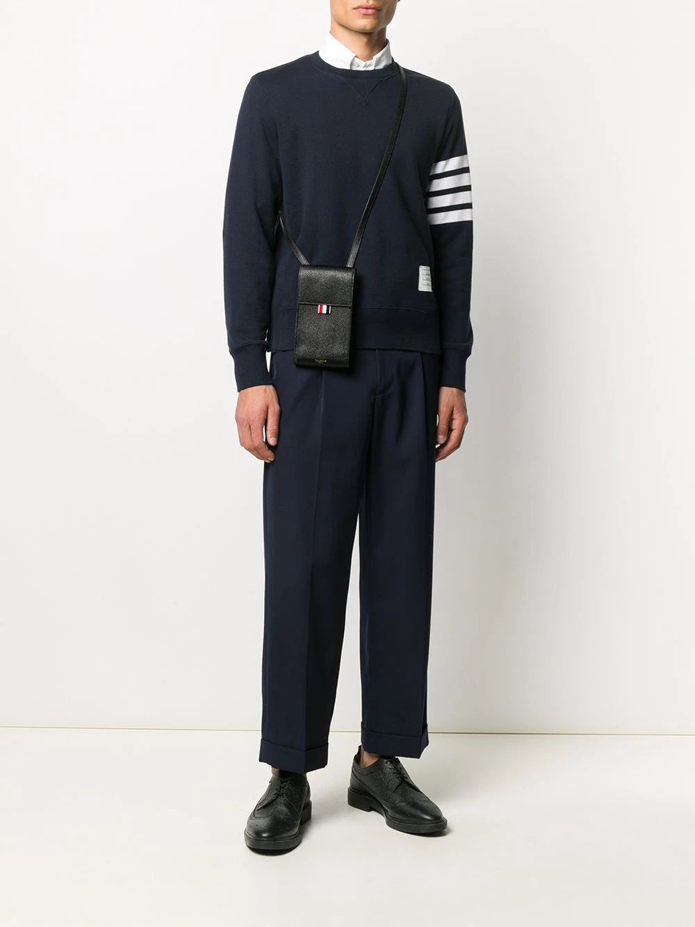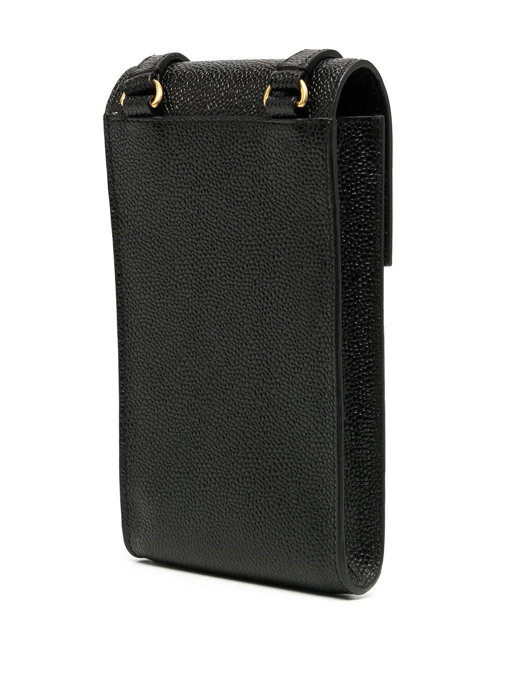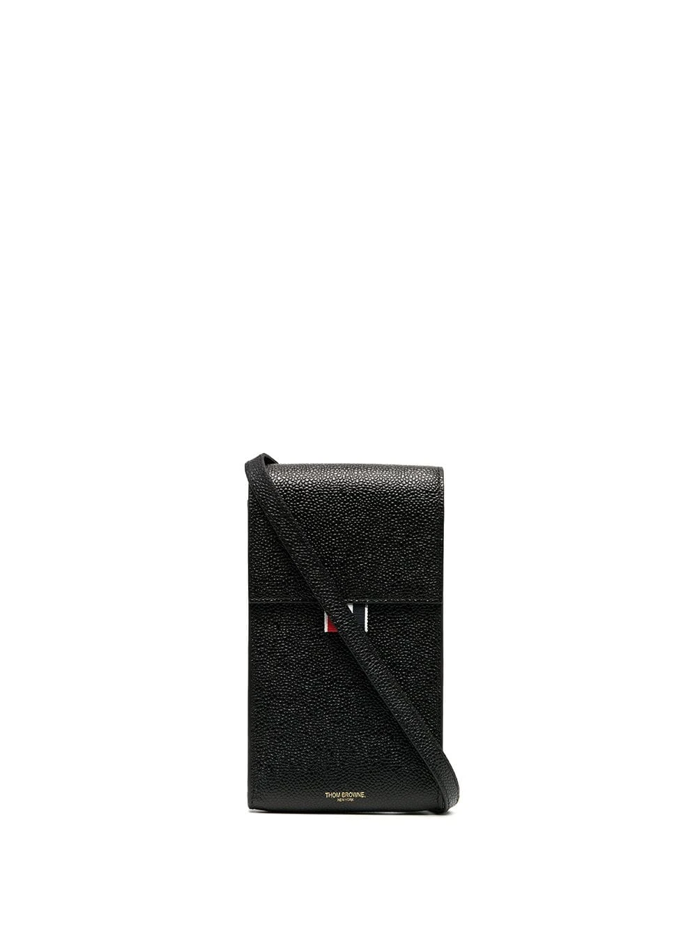 Tired of having your pockets full? Slide your phone in this black calf leather strap phone holder from Thom Browne. Hands-free and elegant. Featuring a shoulder strap, a top flap closure, a main internal compartment, a printed logo to the front, a pebbled leather texture and a signature RWB stripe.