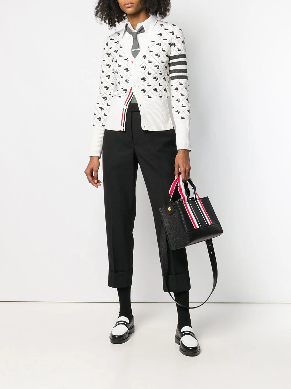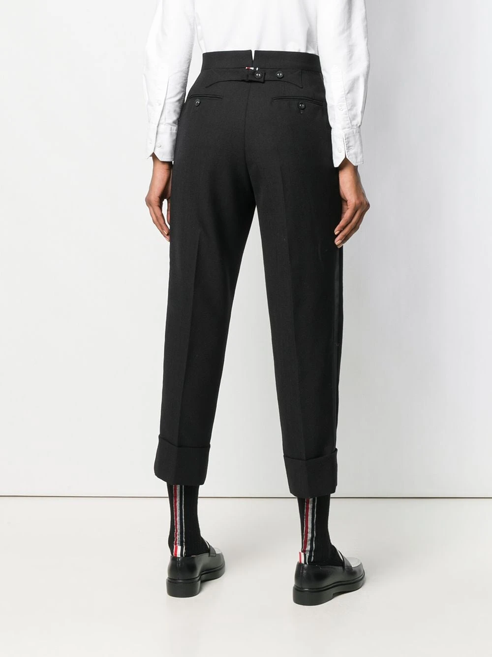 Since its launch in 2003, Thom Browne’s namesake label has gained notoriety for its clean designs and use of luxury materials, as showcased by these black backstrap trousers with a tuxedo stripe in 2Ply Fresco. Featuring a concealed front fastening, side pockets, two back buttoned welt pockets, turn up hems, pleated details, a cropped length and a tricolour grosgrain tab on the rear.