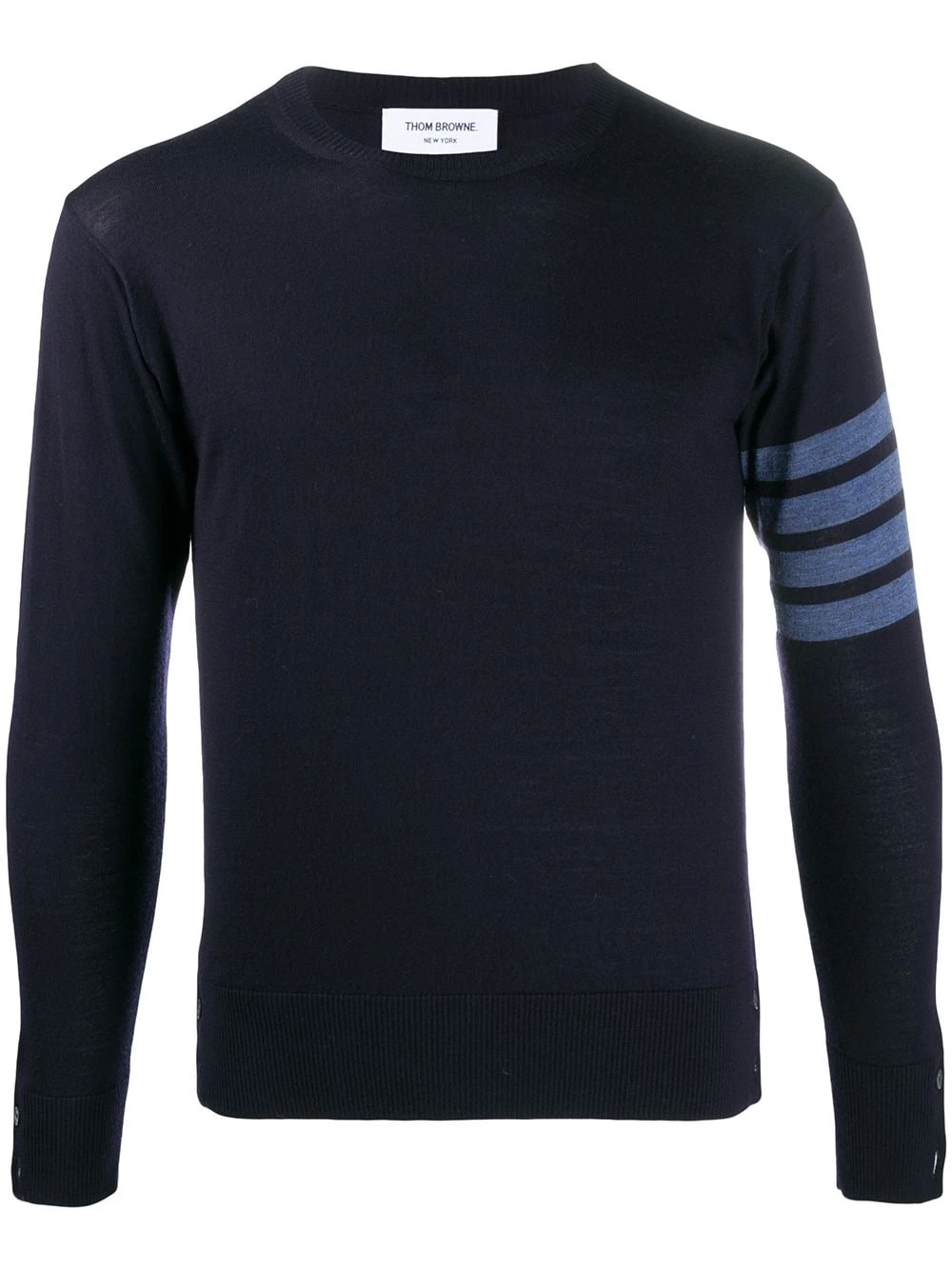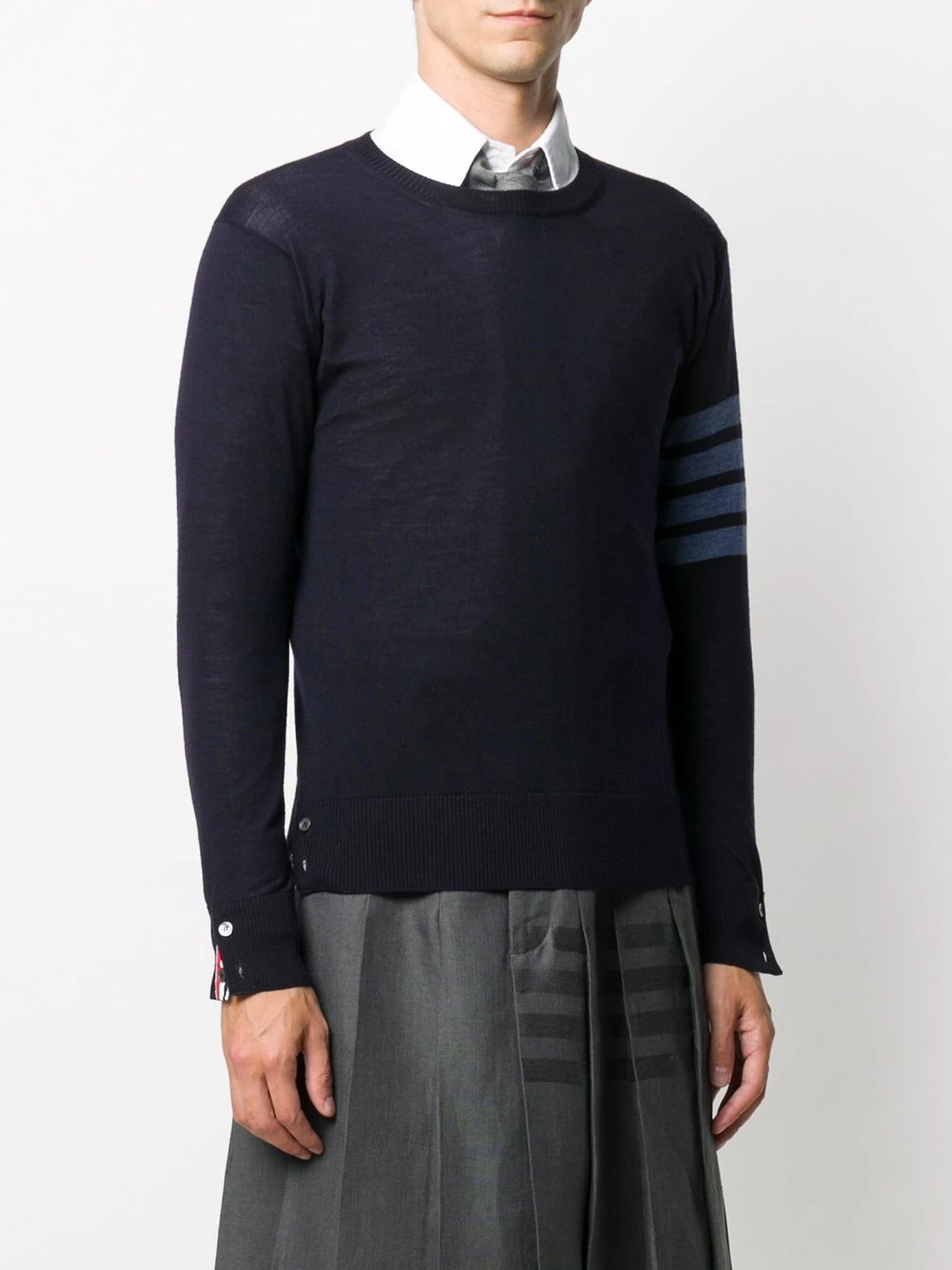 Get ready to meet your new favourite sweater. Fashioned from a navy fine merino wool, this slim fitting crew neck sweater is detailed with tri-colour striped trims and a 4-Bar motif to one sleeve. So classically Thom Browne.