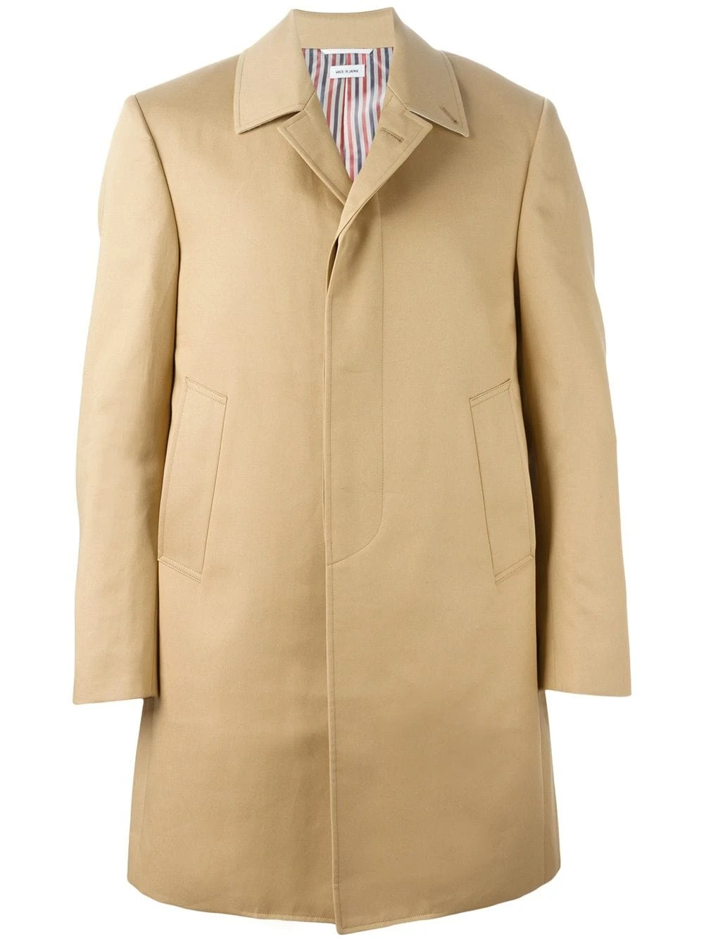 Beige cotton mac bal collar overcoat from THOM BROWNE featuring a classic collar, a button fastening, long sleeves, side pockets and button cuffs.