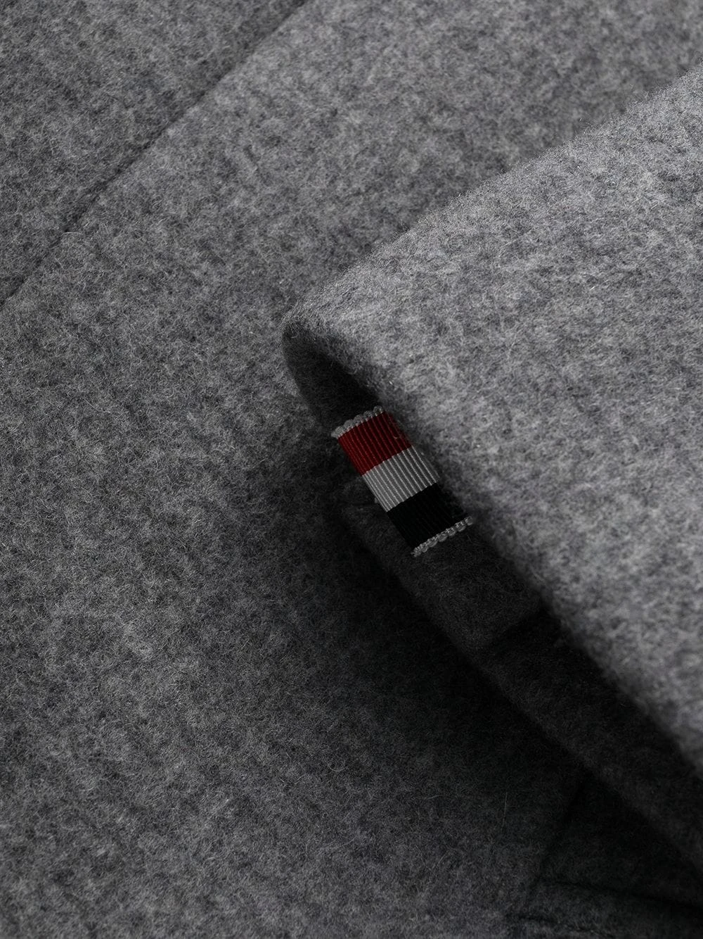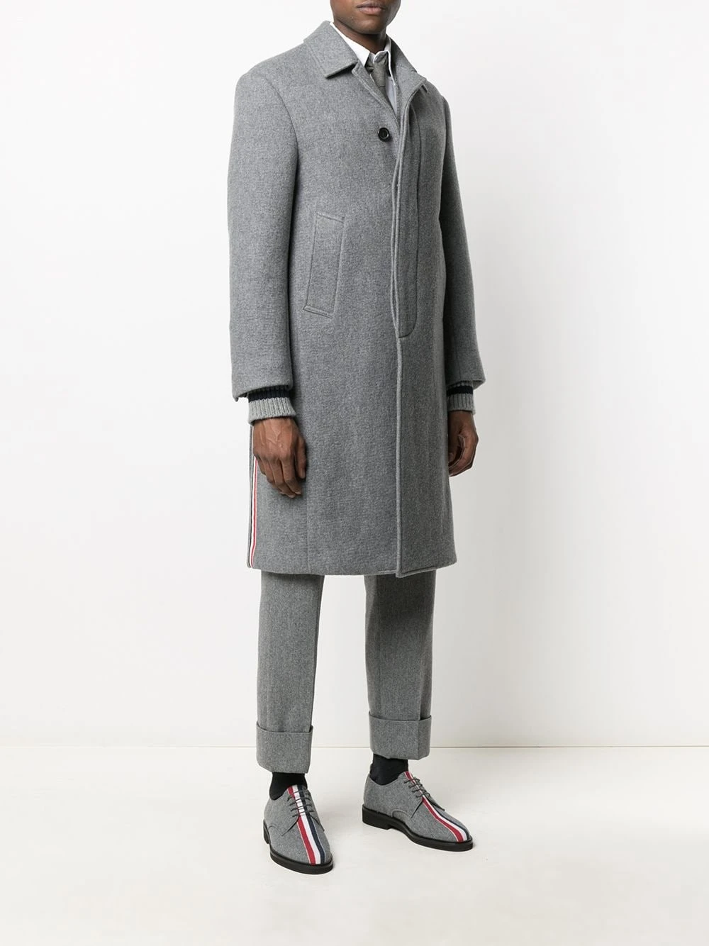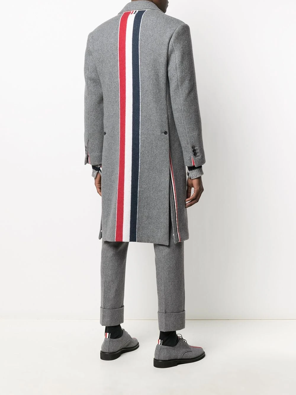 The weather outside might be frightful, but that doesn’t mean you can’t look delightful. In a medium grey hue with a RWB ribbon stripe to the rear, this tailored coat from Thom Browne is here to keep you layered up and looking your best.