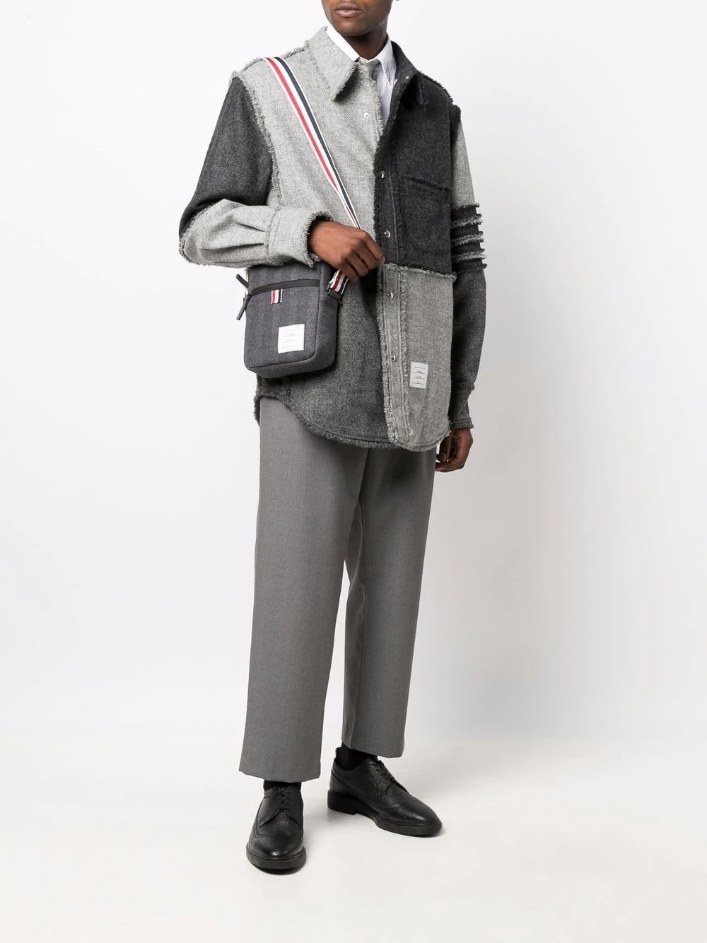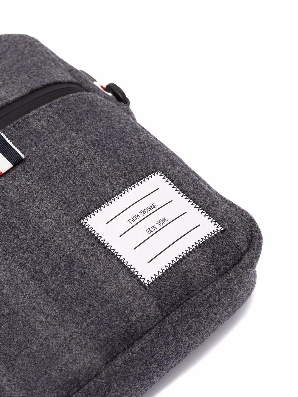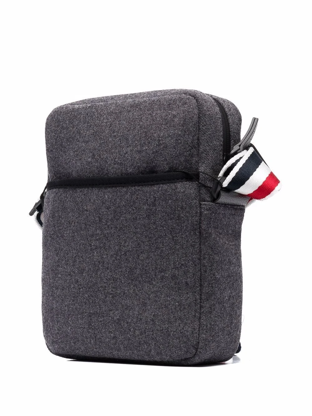Thom Browne transforms its usually subtle tricolour signature detail into the centre of this messenger bagβs design. The houseβs iconic red, navy blue and white stripes is seen here as an adjustable shoulder trap, paired with a grey wool-cashmere blend accessory.