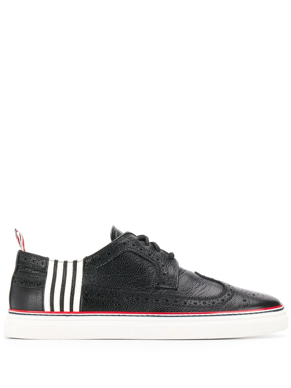 Thom Browne’s newest edit captures the immaculate craftsmanship and minimalist designs that have come to define the American label. Crafted from black pebbled leather, these brogue sneakers feature a round toe, a lace-up front fastening, decorative perforations, a stripe detail to the side, a flat rubber sole and a signature tri-colour striped trim.