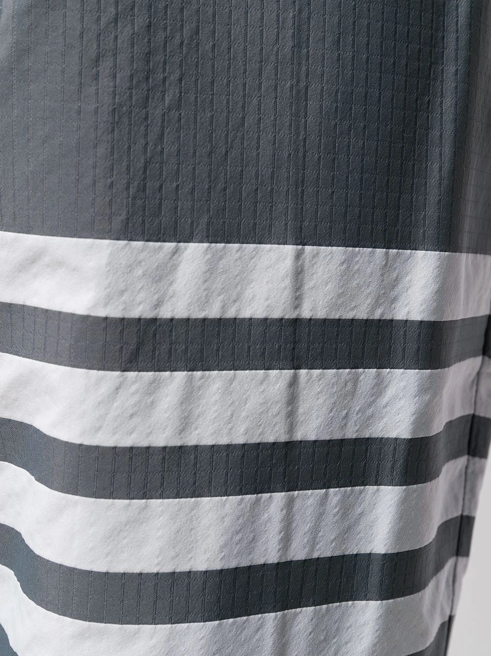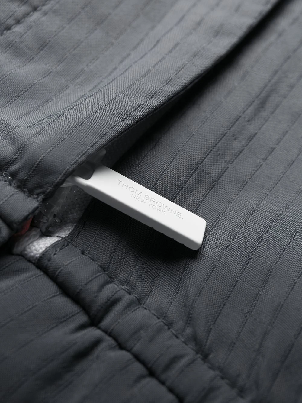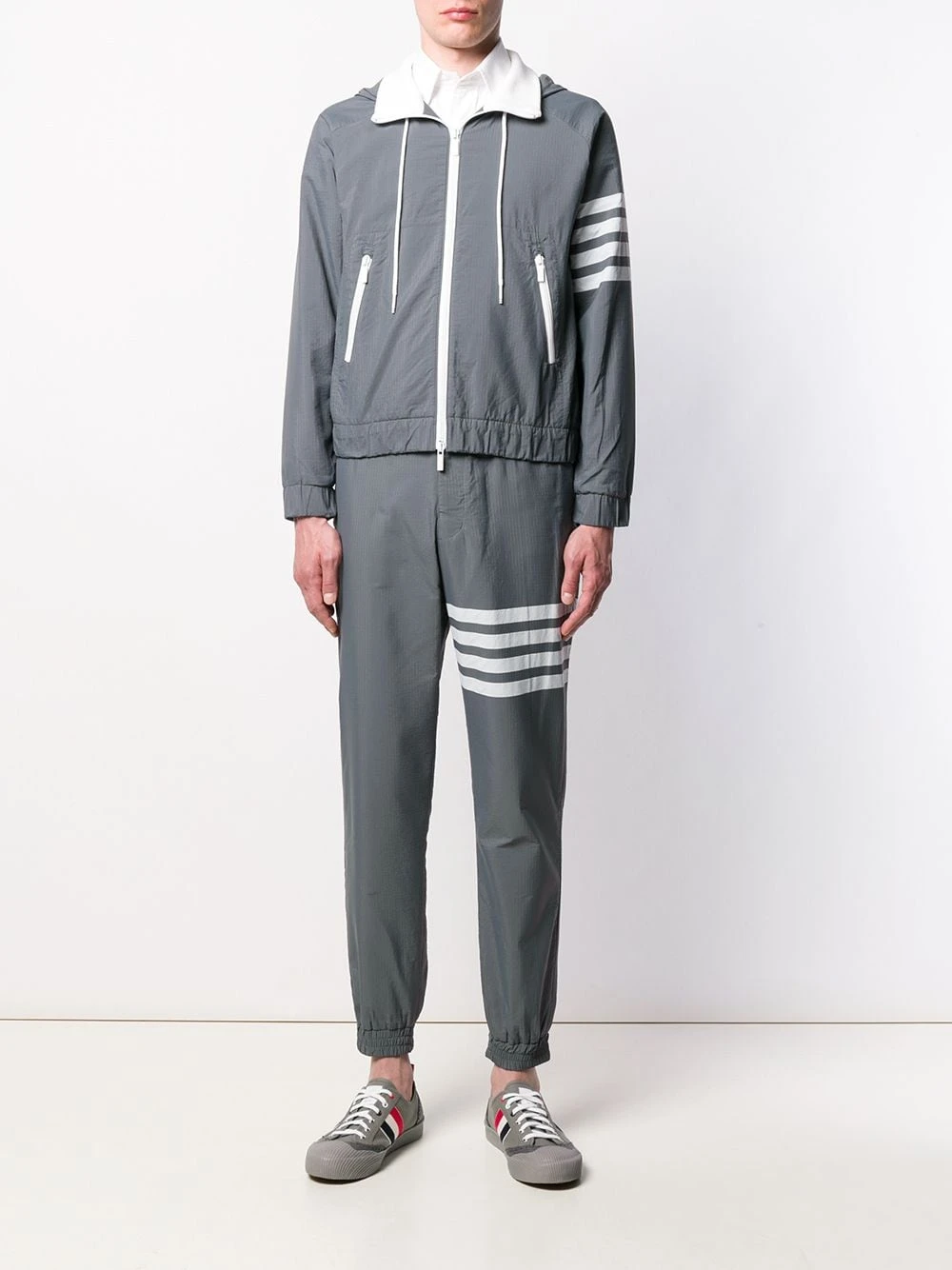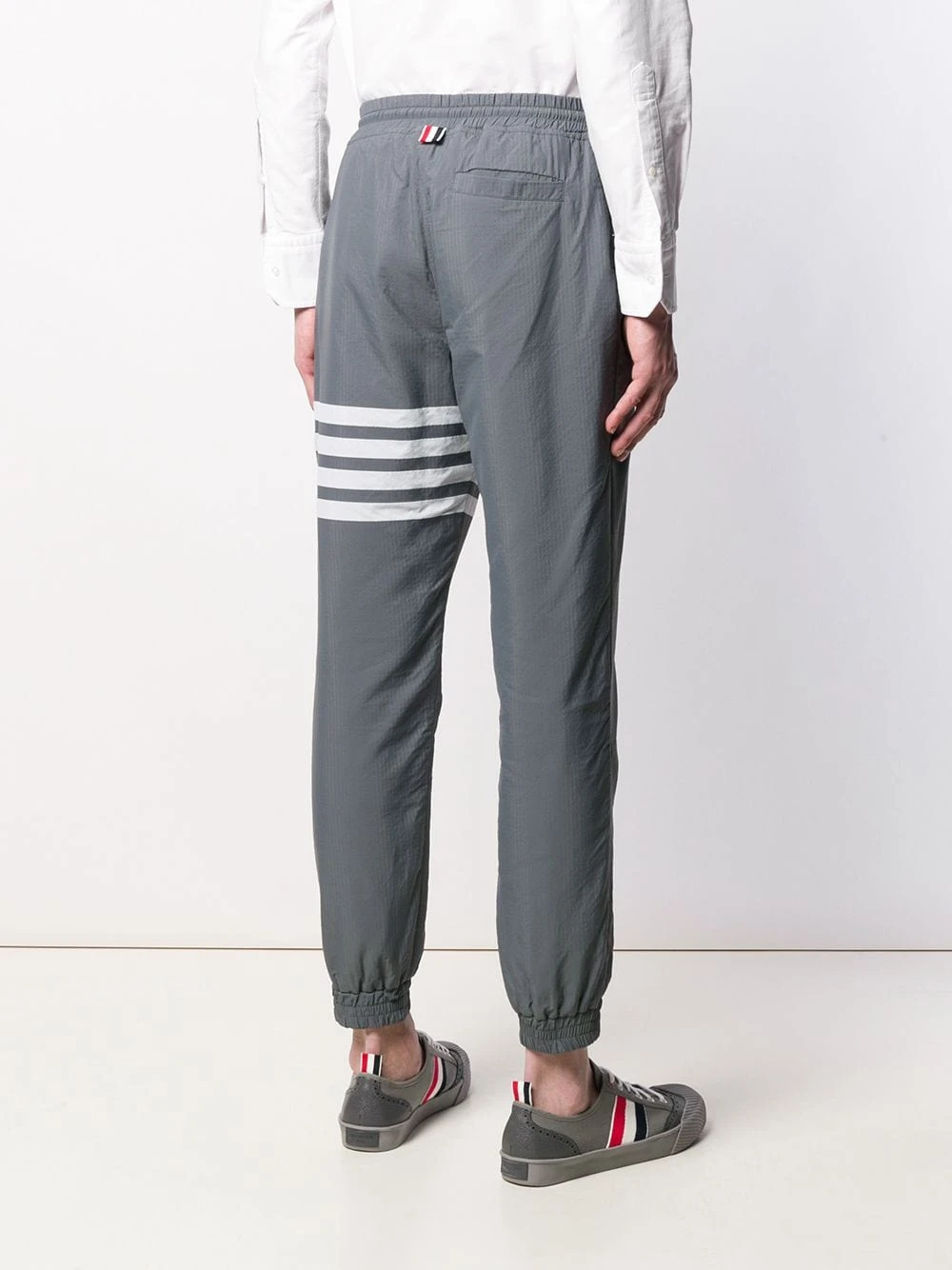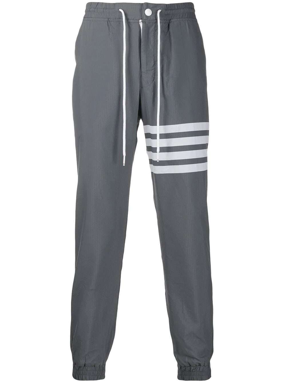Looking for classic wardrobe pieces with a distinctive edge? Thom Browne will give you an easy route. These medium grey engineered 4-bar track pants from Thom Browne feature an elasticated drawstring waist, side slit pockets, a tricolour tab to the back, a slim leg with gathered ankles and the signature 4-Bar stripes to the left thigh.