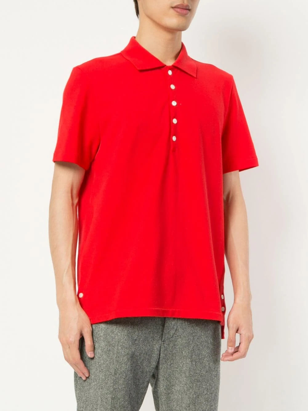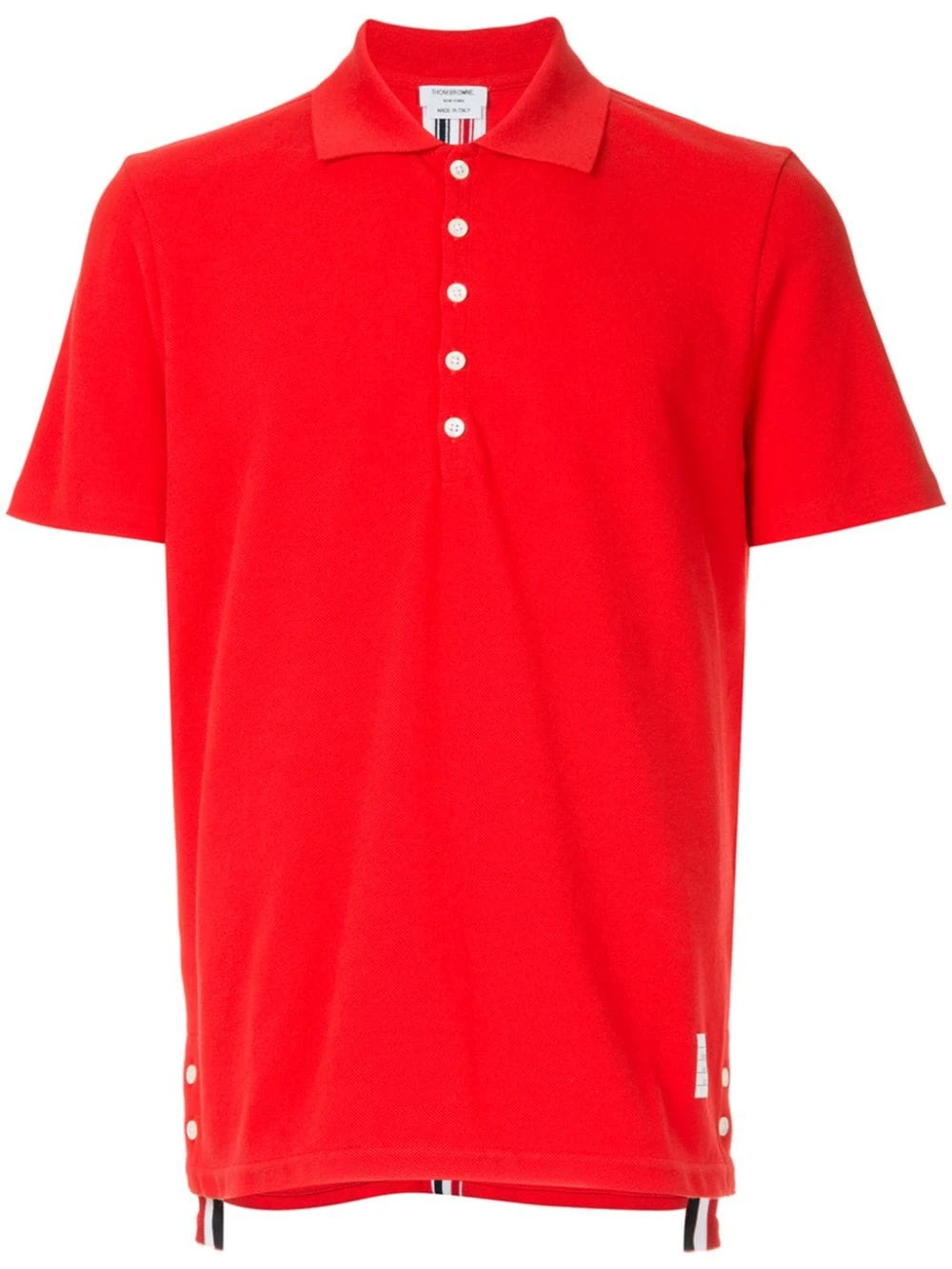 Combining highest-quality fabrics and a conservative sensibility with a touch of irreverence and humour, Thom Browneβs Spring/Summer 2019 is full of modern must-haves. This red cotton center-back stripe polo shirt from Thom Browne features a classic polo collar, a front button placket, short sleeves, a straight hem and a high low hem.