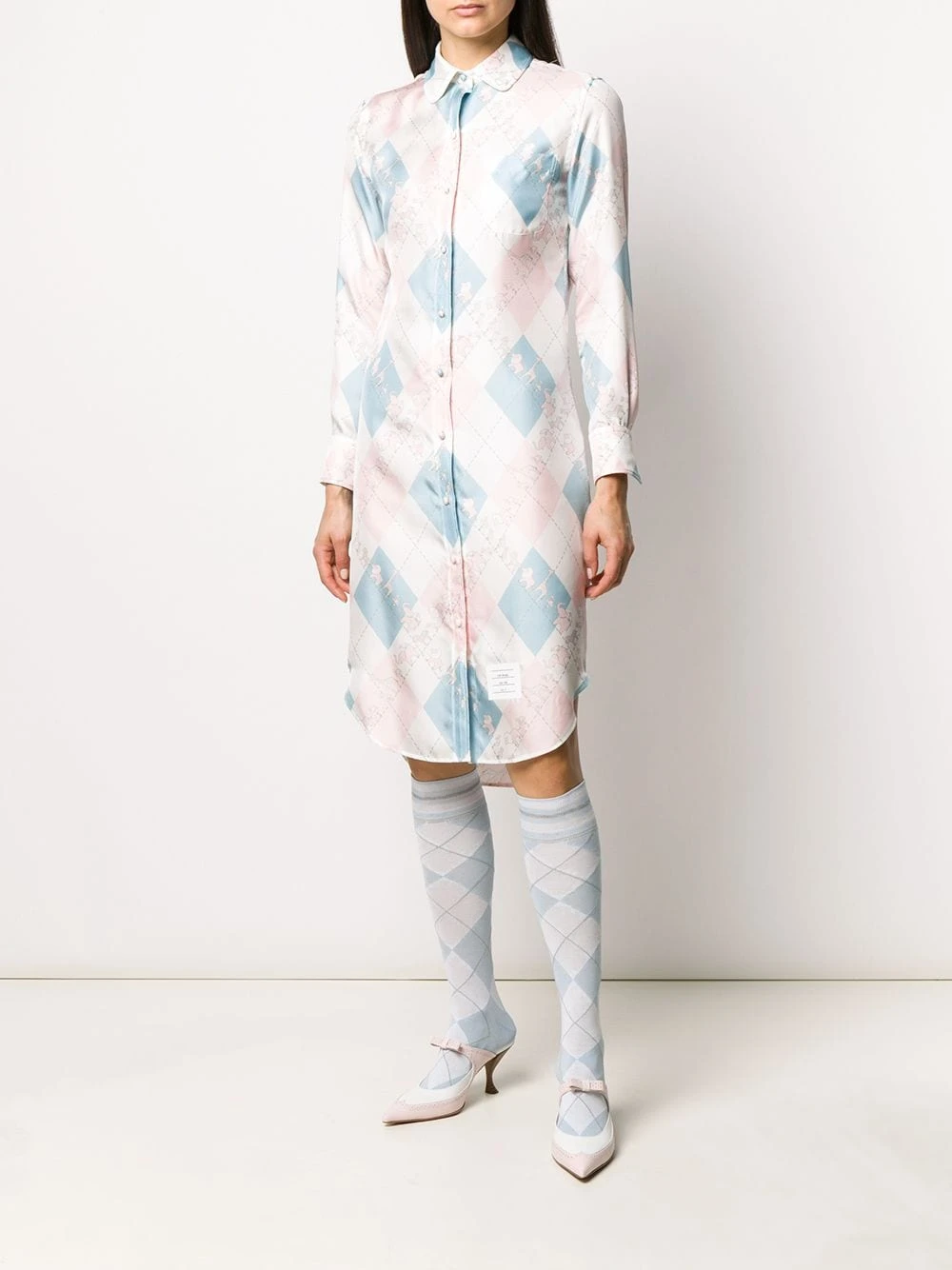 Classy enough to get to the office and stylish enough for a date with friends, this white, blue and pink silk classic printed shirt dress from Thom Browne is an instant upgrade. Simple, stylish and pretty feminine! Undoubtedly an essential piece. Featuring a classic collar, a front button fastening, long sleeves, button cuffs, a curved hem, a mid-length and all-over print.